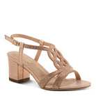 Elevate your look with these stylish block heel sandals, featuring an intricate scrollwork design on the T-strap for a touch of elegance and sophistication.