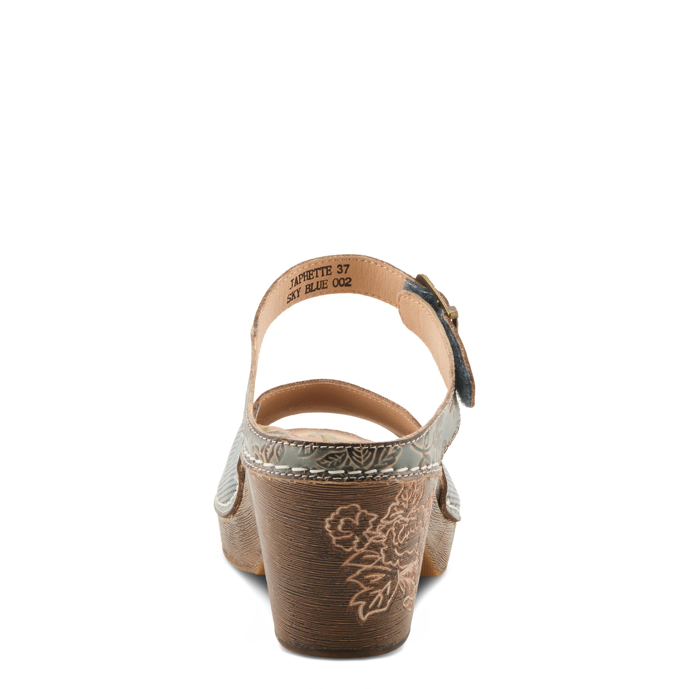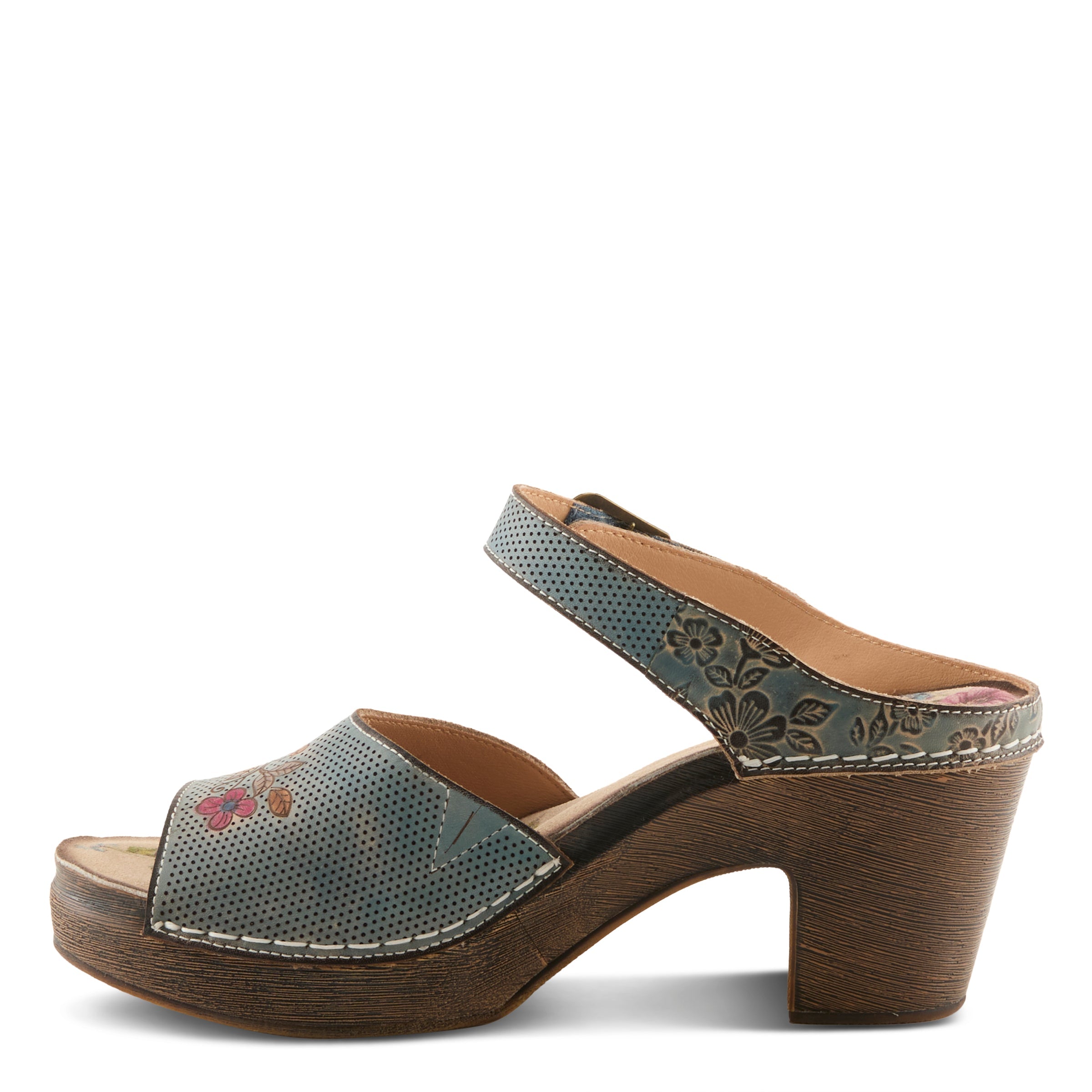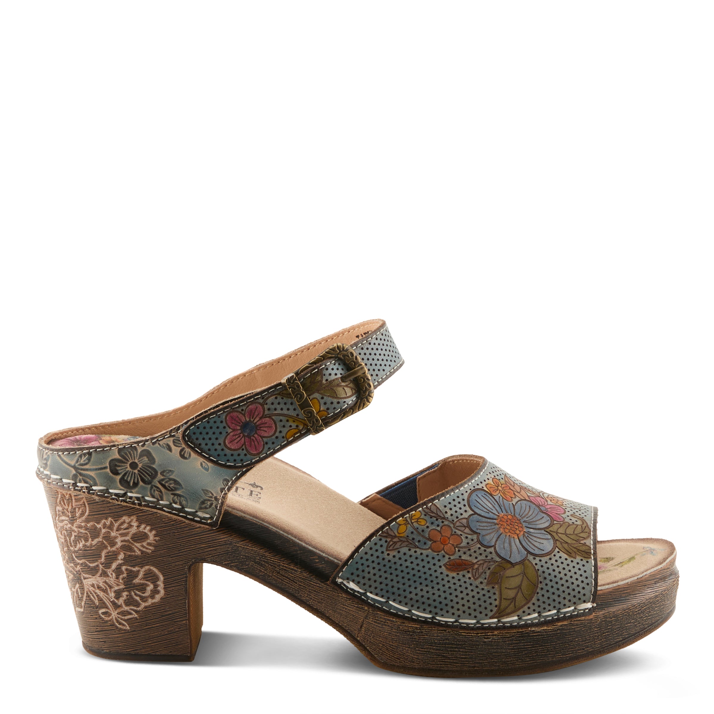 Elevate your everyday with this charming sandal, crafted in hand-painted perforated and embossed leather that showcases vibrant floral artistry. An easy hook-and-loop closure with an antique-inspired buckle provides a secure fit, while the sculpted block heel features delicate floral etching for timeless appeal. Inside, a printed floral microsuede insole with extra padding ensures all-day comfort. This sandal blends artisanal beauty with dependable wearability.