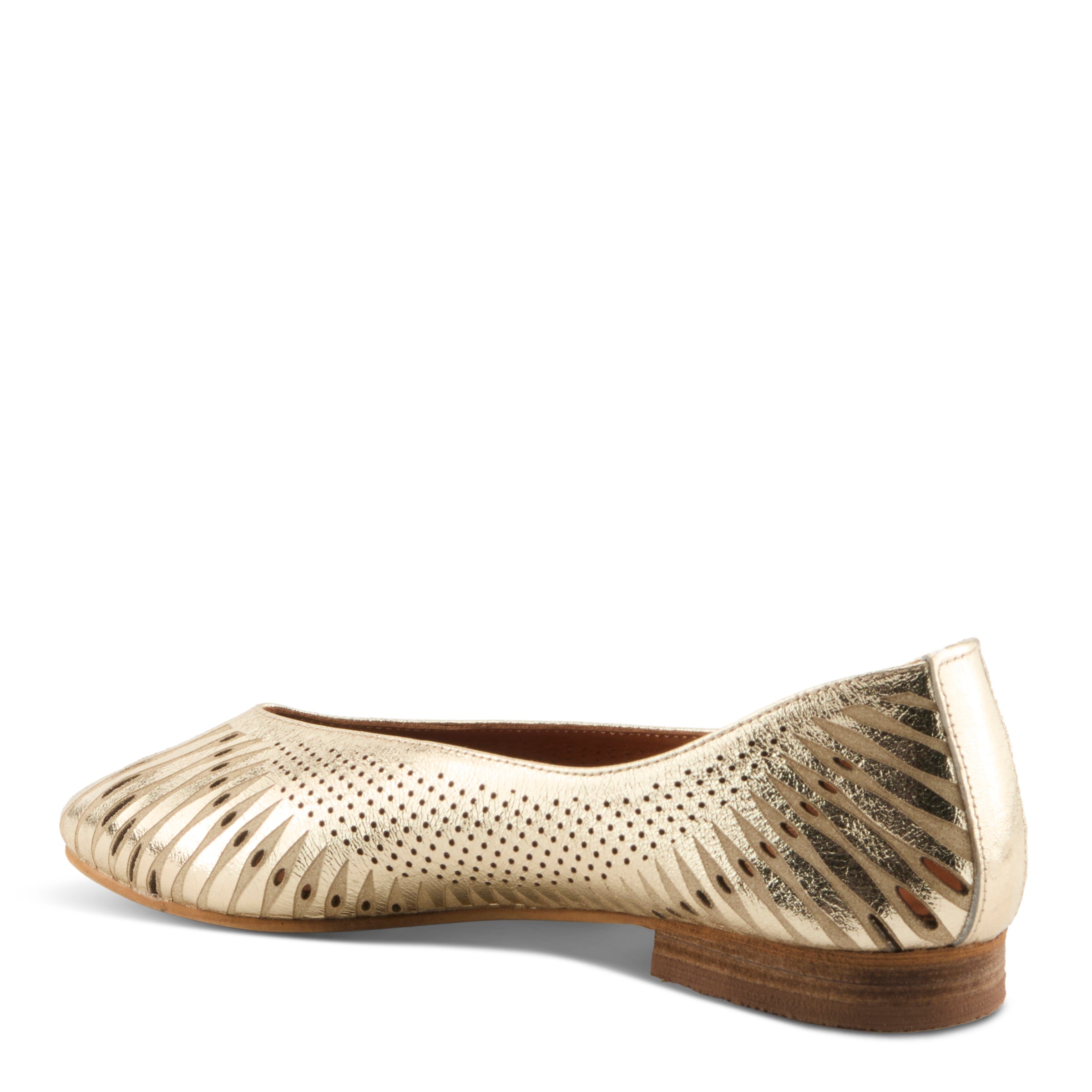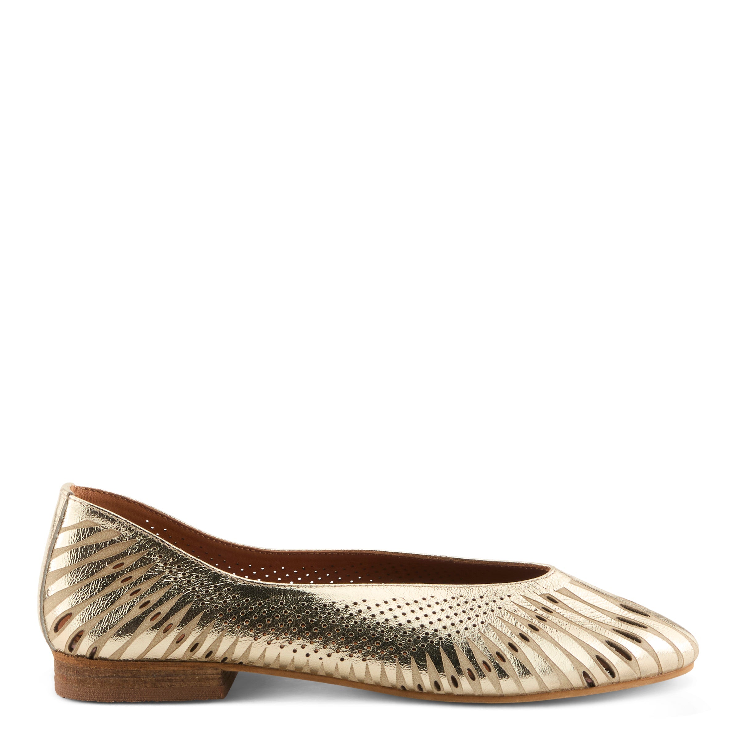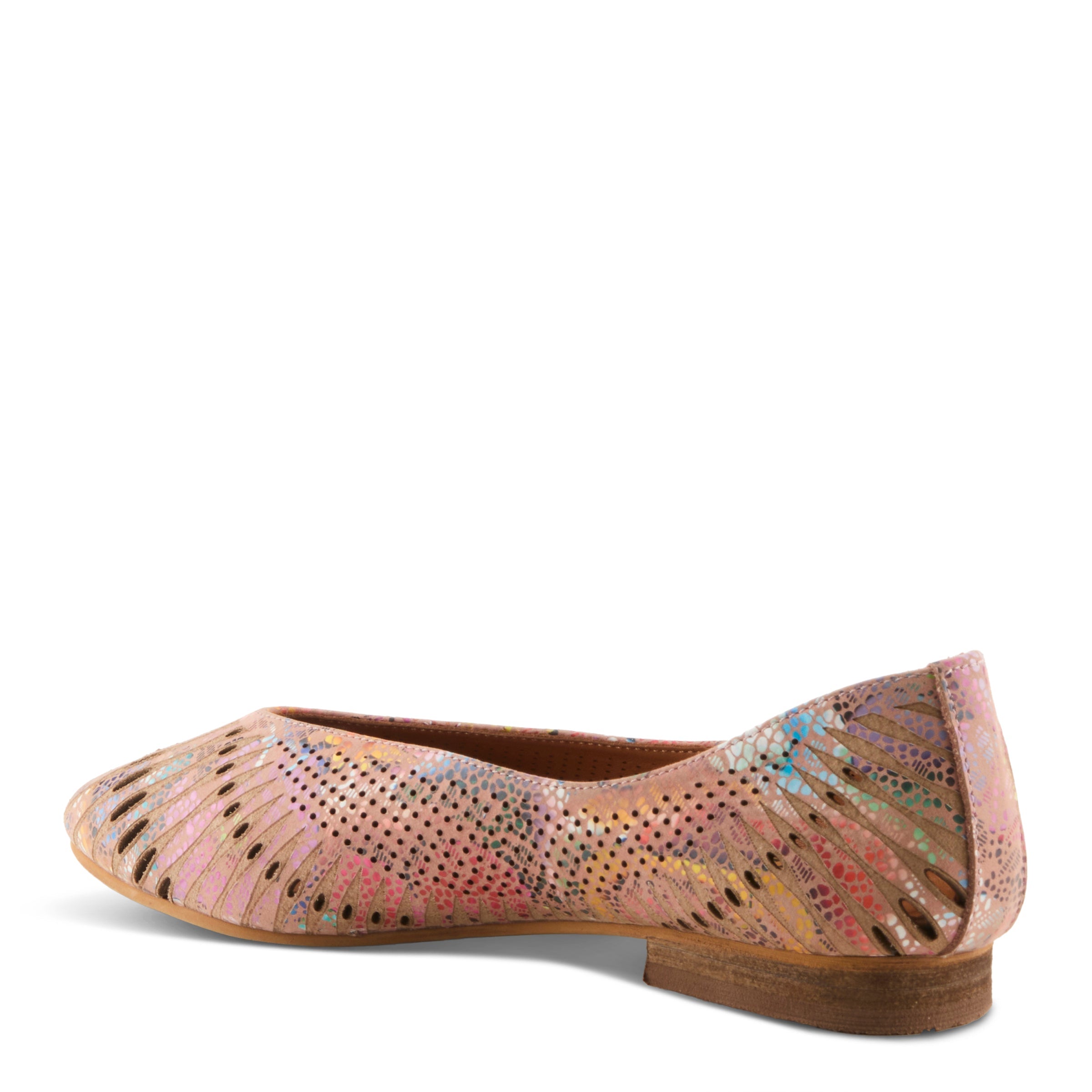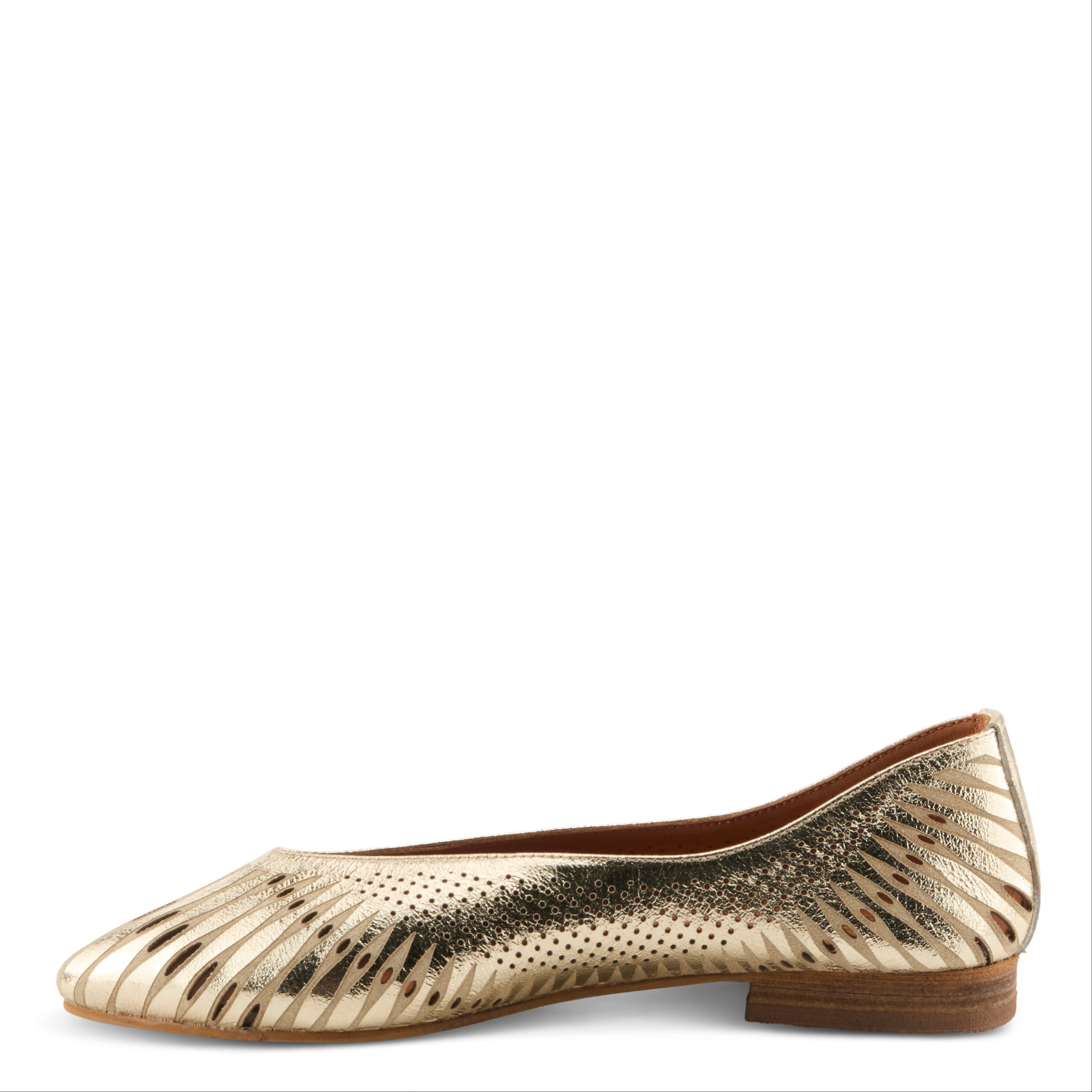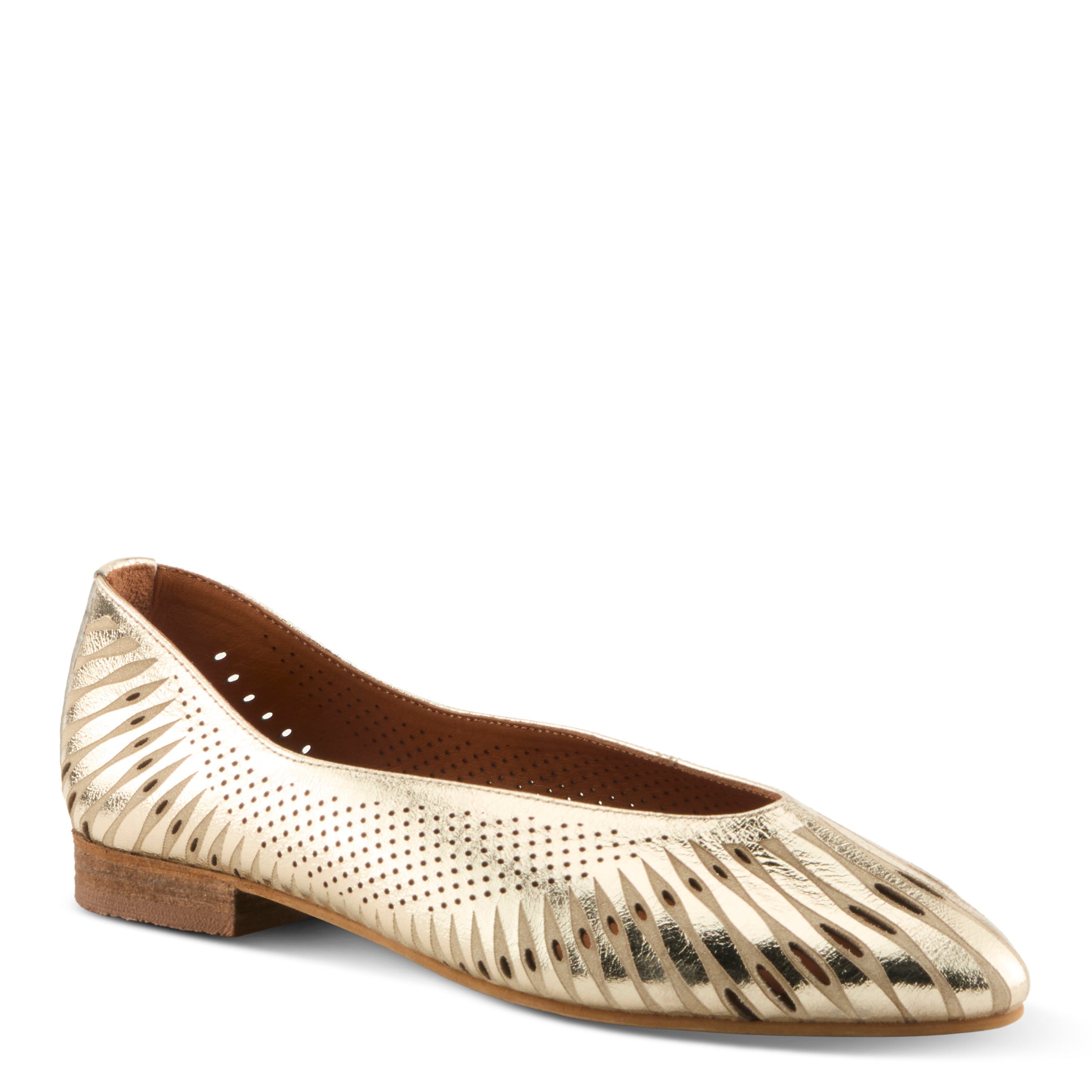 Refined and versatile, this flat is crafted in rich leather with a sleek pointy toe for timeless polish. The upper features an artistic mix of cutout lines and delicate perforated pindots, creating a graceful pattern across the vamp and sides. The gently curved topline outlines the foot with understated elegance, enhancing the shoe’s tailored silhouette. Whether in luminous metallic or a kaleidoscope of multicolor tones, this style transitions seamlessly from office days to casual evenings, pairing effortlessly with trousers, skirts, or dresses. Made in Turkey, it offers all-leather lining and insole for breathable comfort that complements its sophisticated charm.