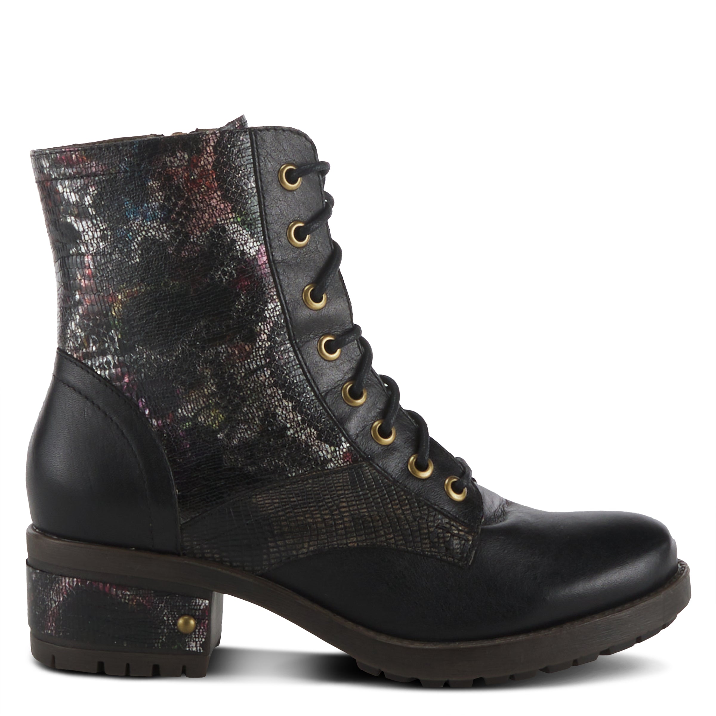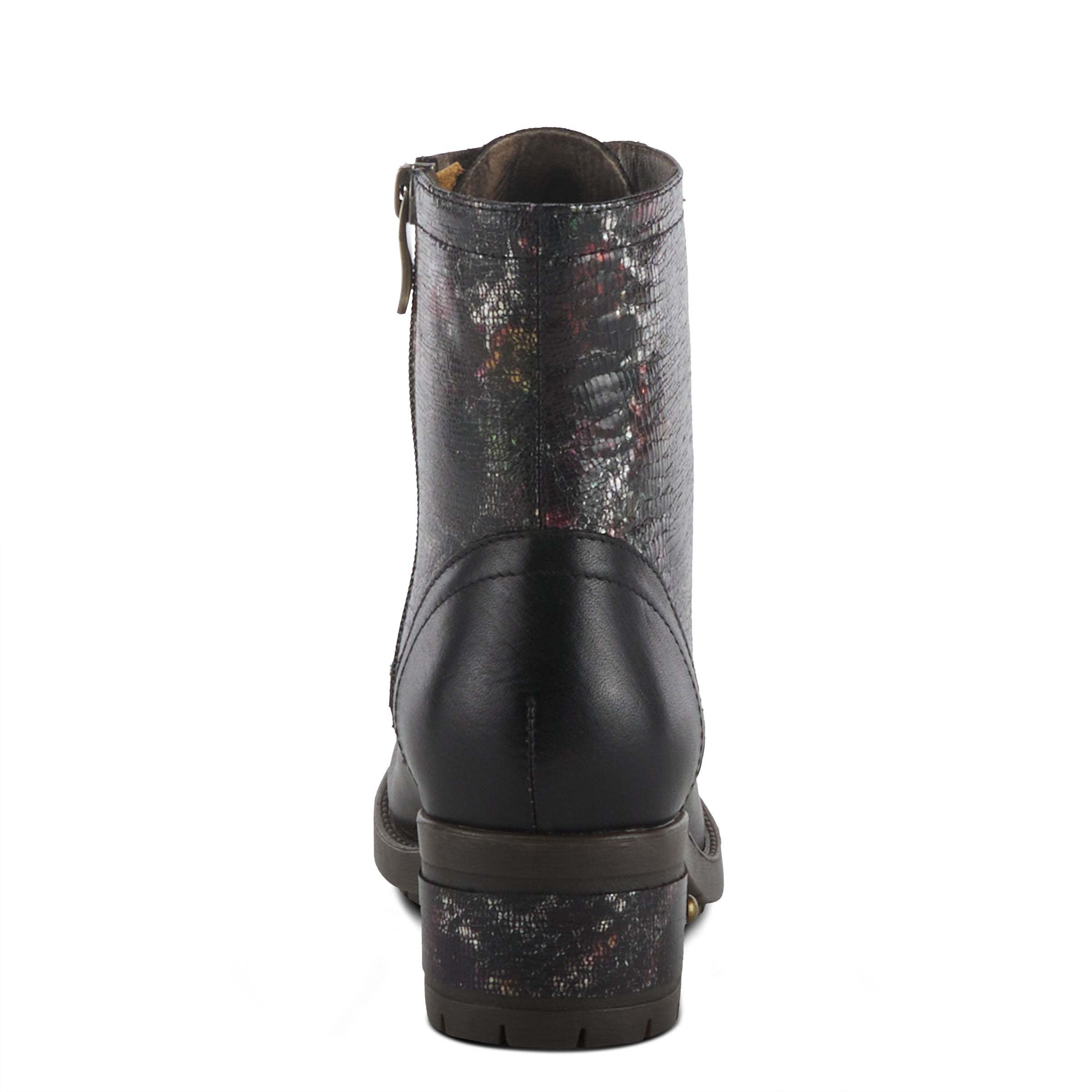 Esta bota es una sorprendente combinación de elementos vanguardistas y femeninos. La piel de serpiente sintética metalizada y el estampado floral añaden textura e interés, mientras que el diseño multicolor le da un toque atrevido y divertido. El patrón en relieve se extiende hasta el talón, creando una apariencia cohesiva y llamativa. El cierre de cremallera garantiza un ajuste seguro y cómodo.