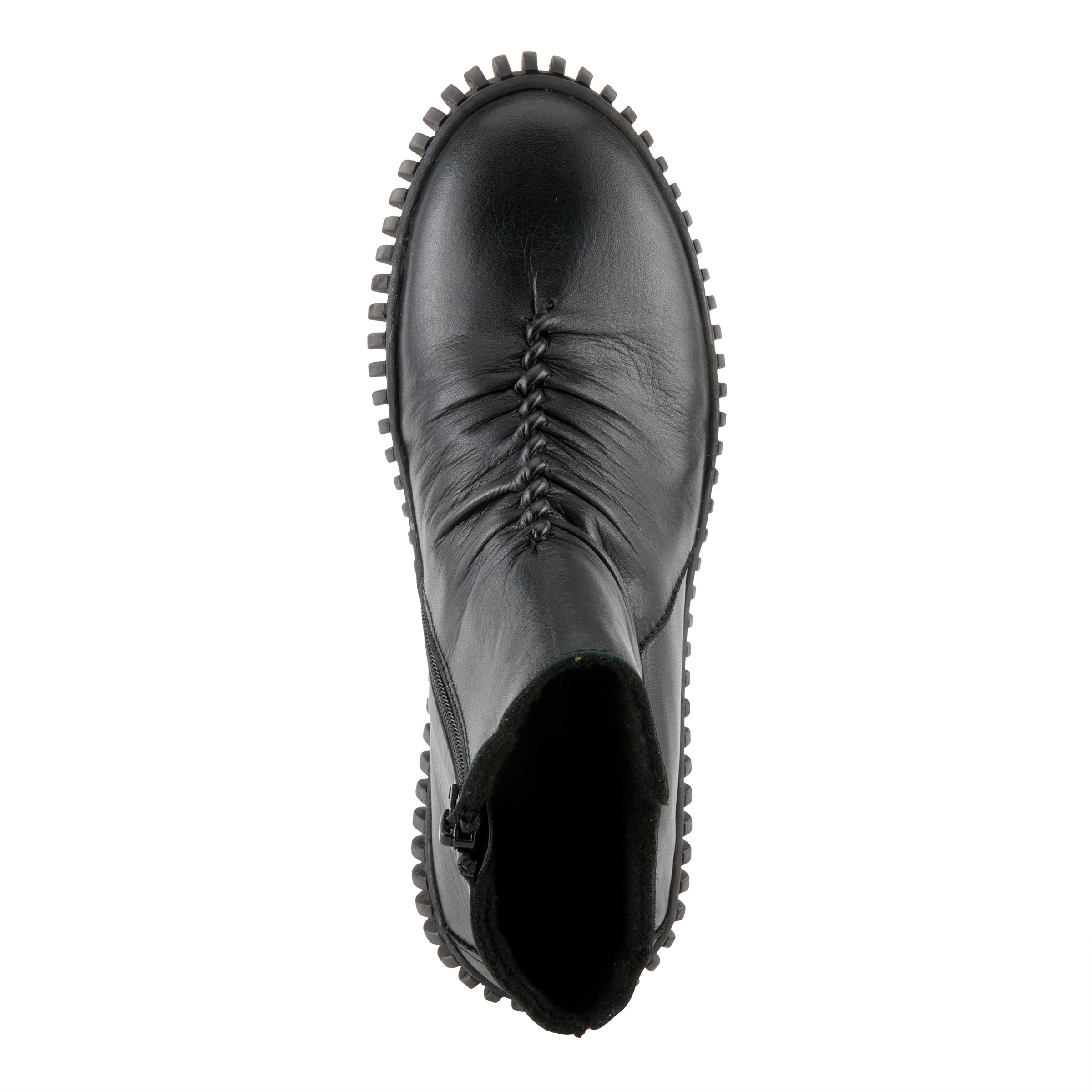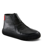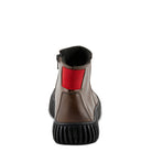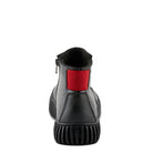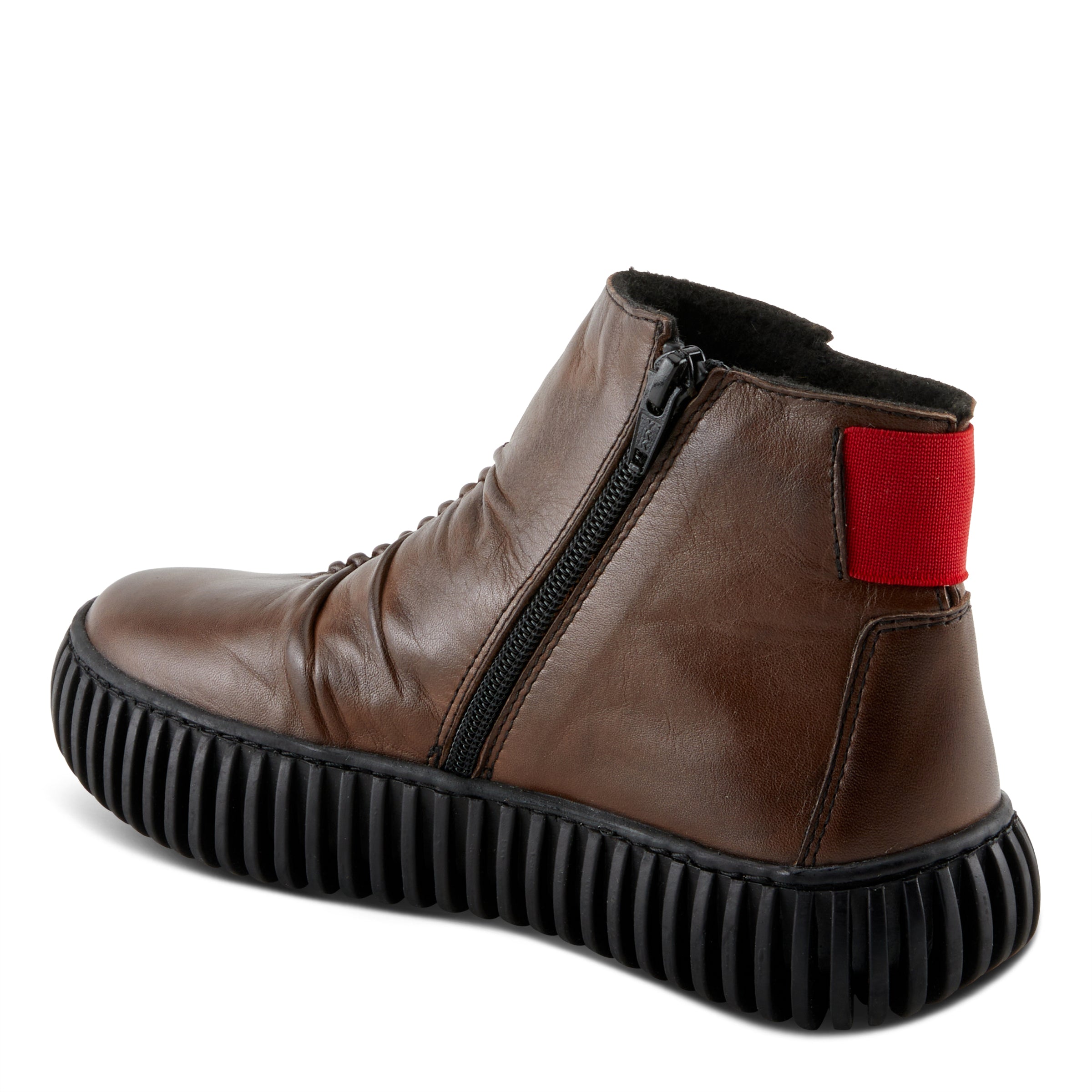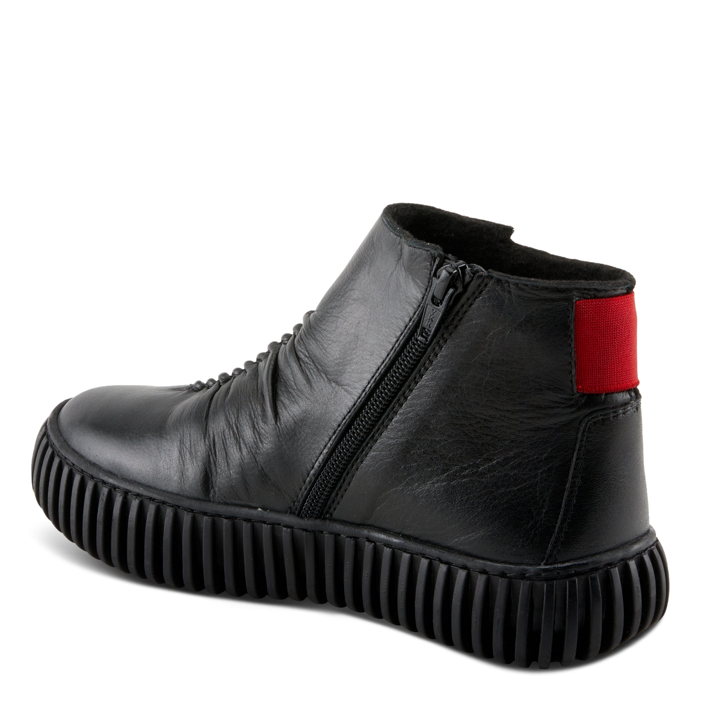Mejora tu colección de calzado con nuestro elegante botín que presenta un llamativo detalle elástico rojo, parte superior de cuero fruncido y una moderna suela de plataforma para darle un toque contemporáneo al estilo clásico.