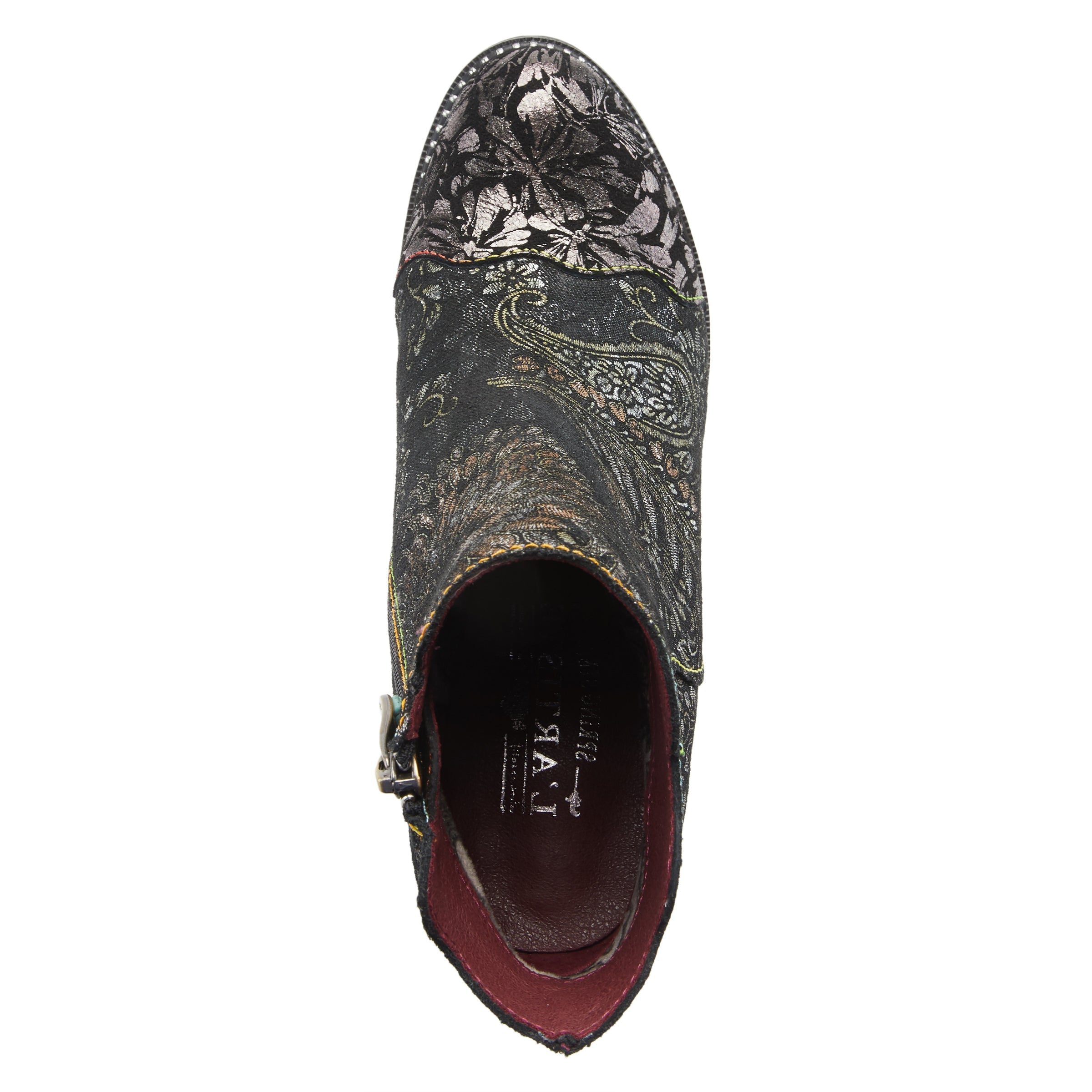 Bota de cuero con estampado metalizado de inspiración francesa con un hermoso estampado floral por todas partes, detalle de costuras de arcoíris vibrantes y cremallera interior para ponérselas y quitárselas fácilmente con un tacón elegante y un diseño ribeteado inspirado en un brazalete.
