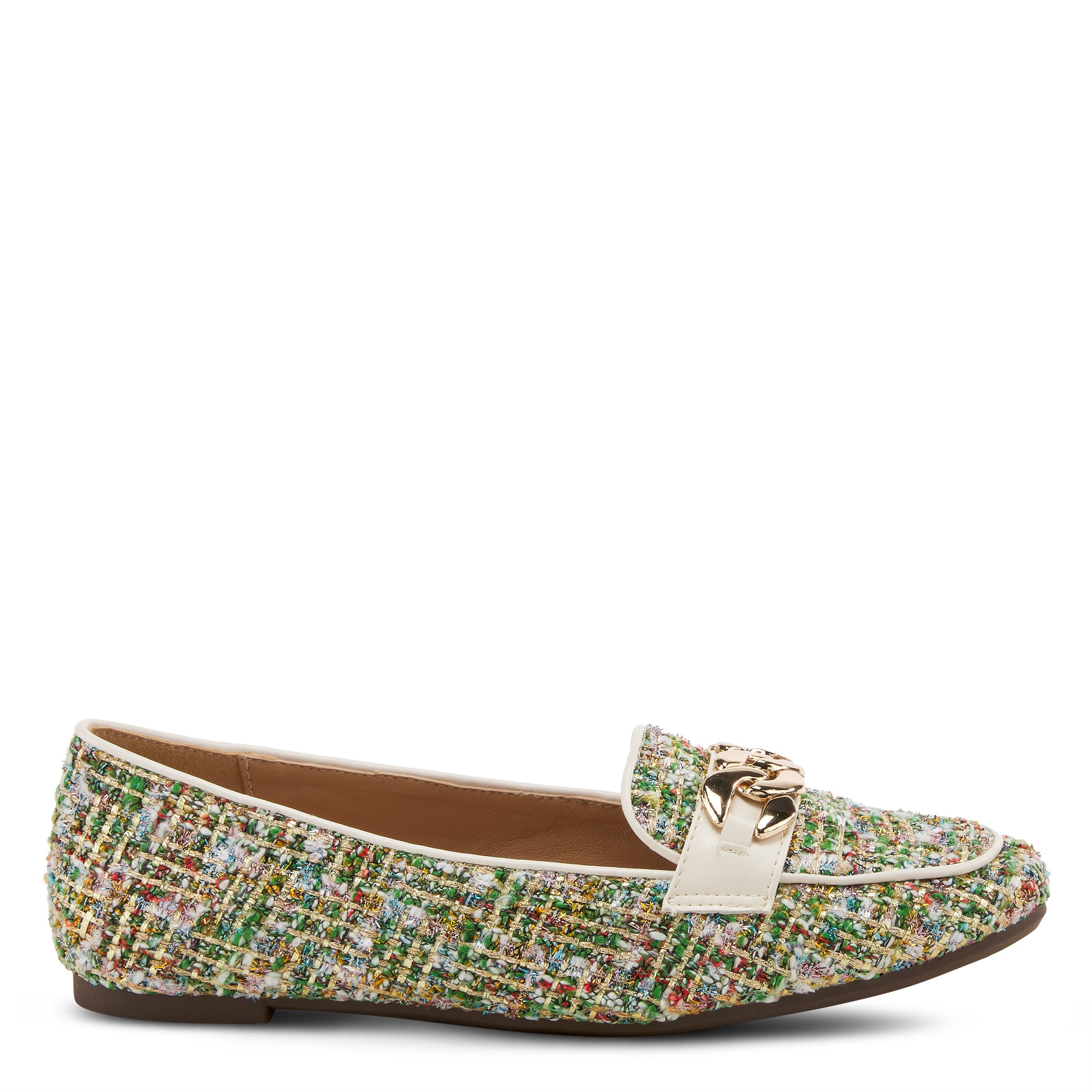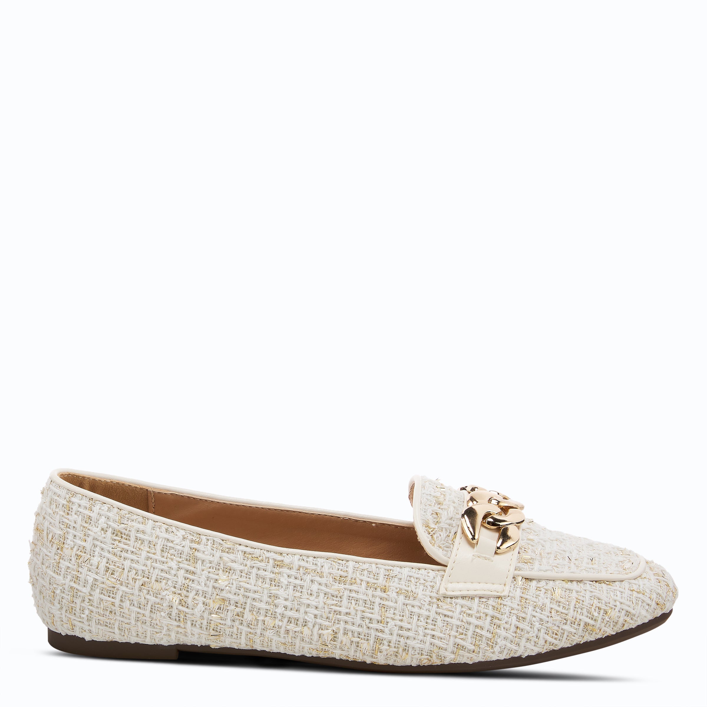 Elegante mocasín de moda con ribete de cuero sintético a tono y adorno de cadena en una plantilla bien acolchada y una suela flexible.