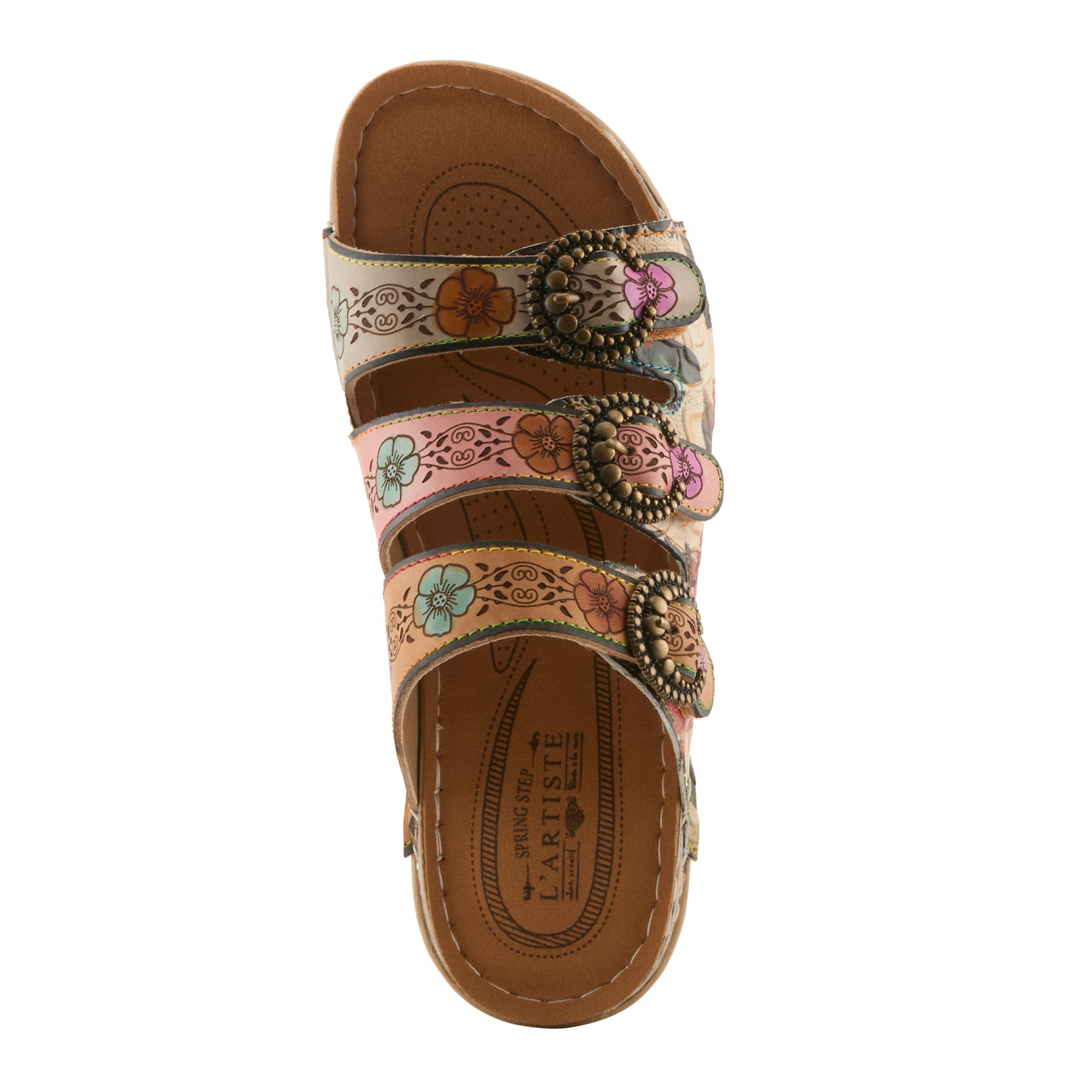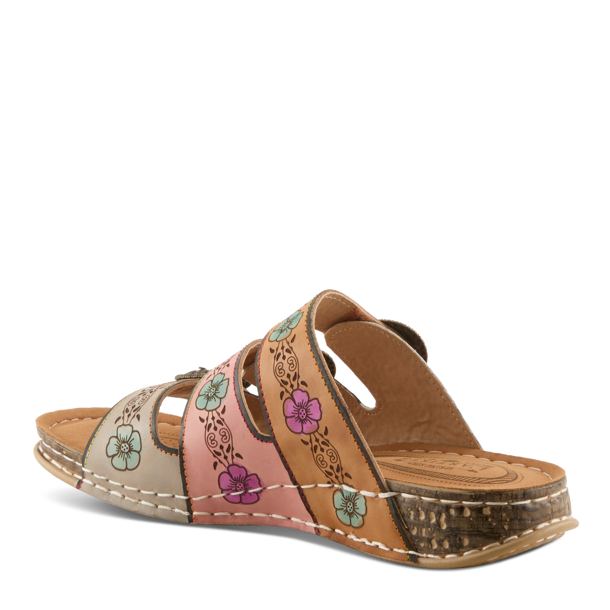 This hand-painted leather sandal brings timeless artistry to everyday comfort. The three-band design is beautifully detailed with embossed and laser-cut floral motifs, while antique-inspired oval buckles add a touch of heritage charm. The buckles, framed with a beaded edge and a delicately engraved floral medallion, elevate the sandal into a wearable piece of art. Built on a softly cushioned footbed and flexible outsole, this style blends tradition and comfort with effortless grace.