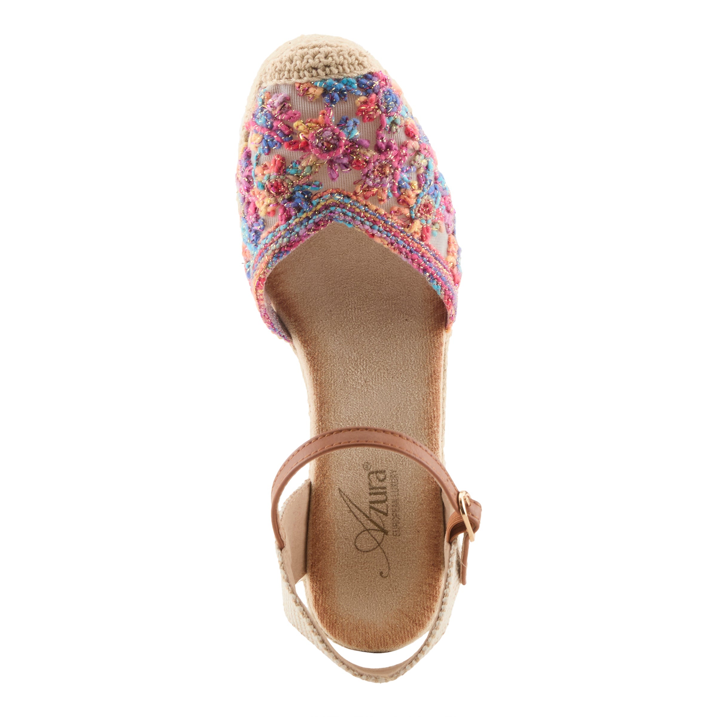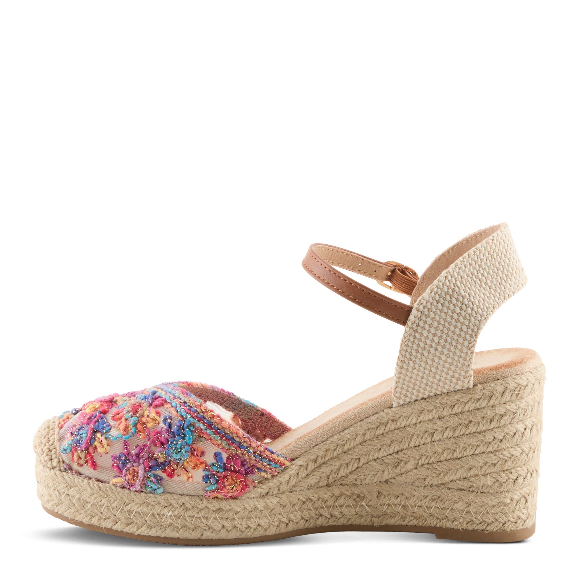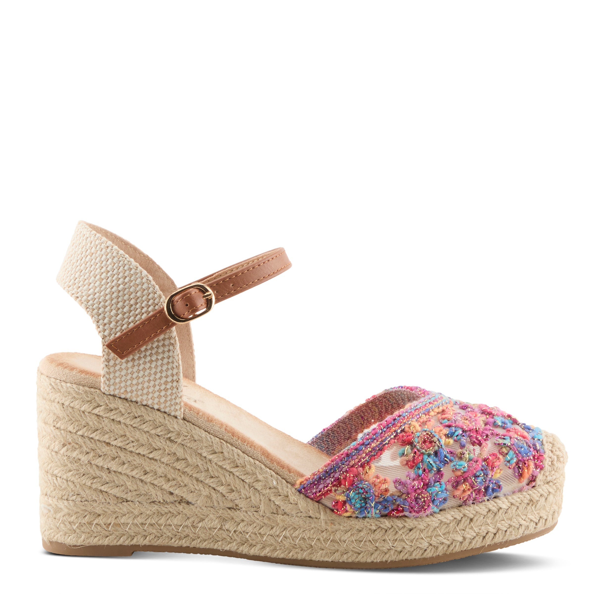 Bring a touch of romance and sophistication to your look with these enchanting espadrille wedges, designed for the true fashionista at heart. The upper features a dreamy combination of sheer textile underlay adorned with delicate mini floral chenille embroidery and shimmering floral accents—making every step a statement in chic elegance. The faux leather ankle strap with buckle closure adds a polished finish, while the microsuede insole ensures lasting comfort.