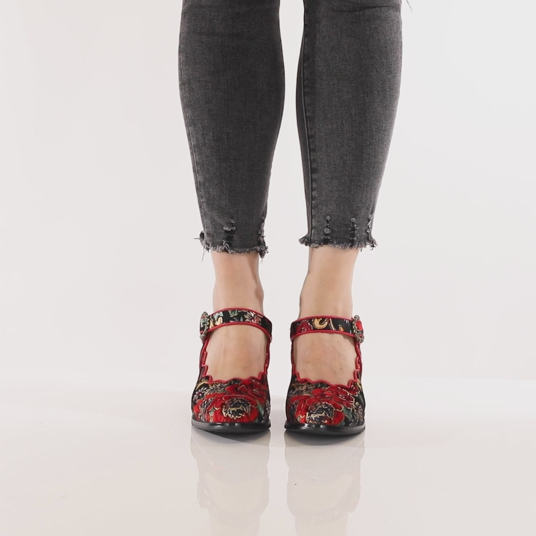These heeled Mary Janes are the epitome of elegance and sophistication with their stunning tapestry floral pattern. The hook and loop closure, along with the decorative buckle, adds a touch of charm and practicality to these beautiful shoes. With their low heel and scalloped edges, they are the perfect choice for any occasion where style and comfort are a must.