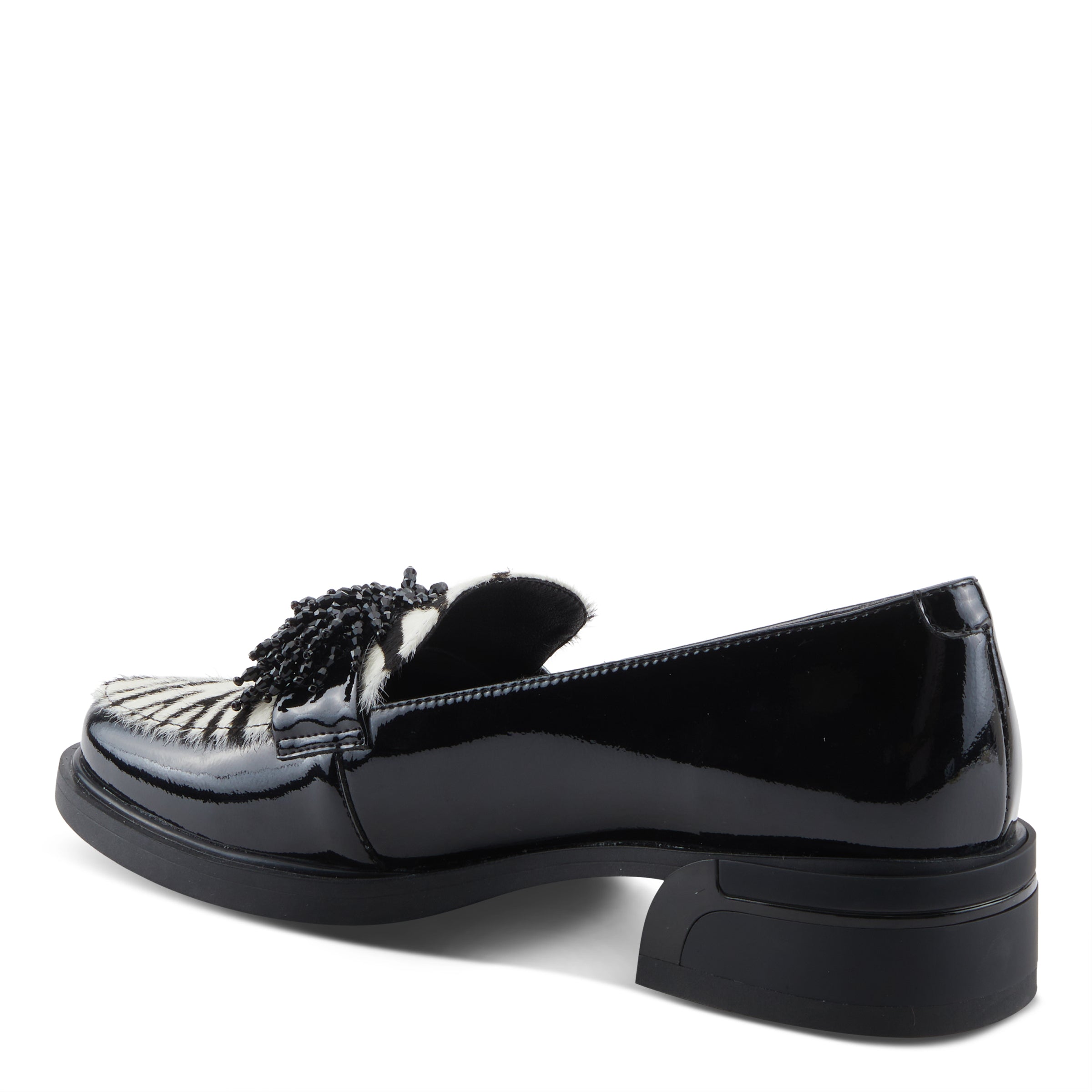 Unleash your wild side with this fiercely chic loafer, where glossy patent meets bold faux hair-on-hide zebra print for an unapologetically modern statement. The vamp is adorned with an ornate collection of black shiny crystals, adding a glamorous edge that catches the light with every step. Set on a sculptural block heel, this loafer is designed for the fashion-forward, blending bold textures with luxe detailing. Perfect for elevating everyday looks or adding an edge to eveningwear, this style is as versatile as it is unforgettable