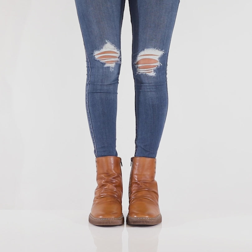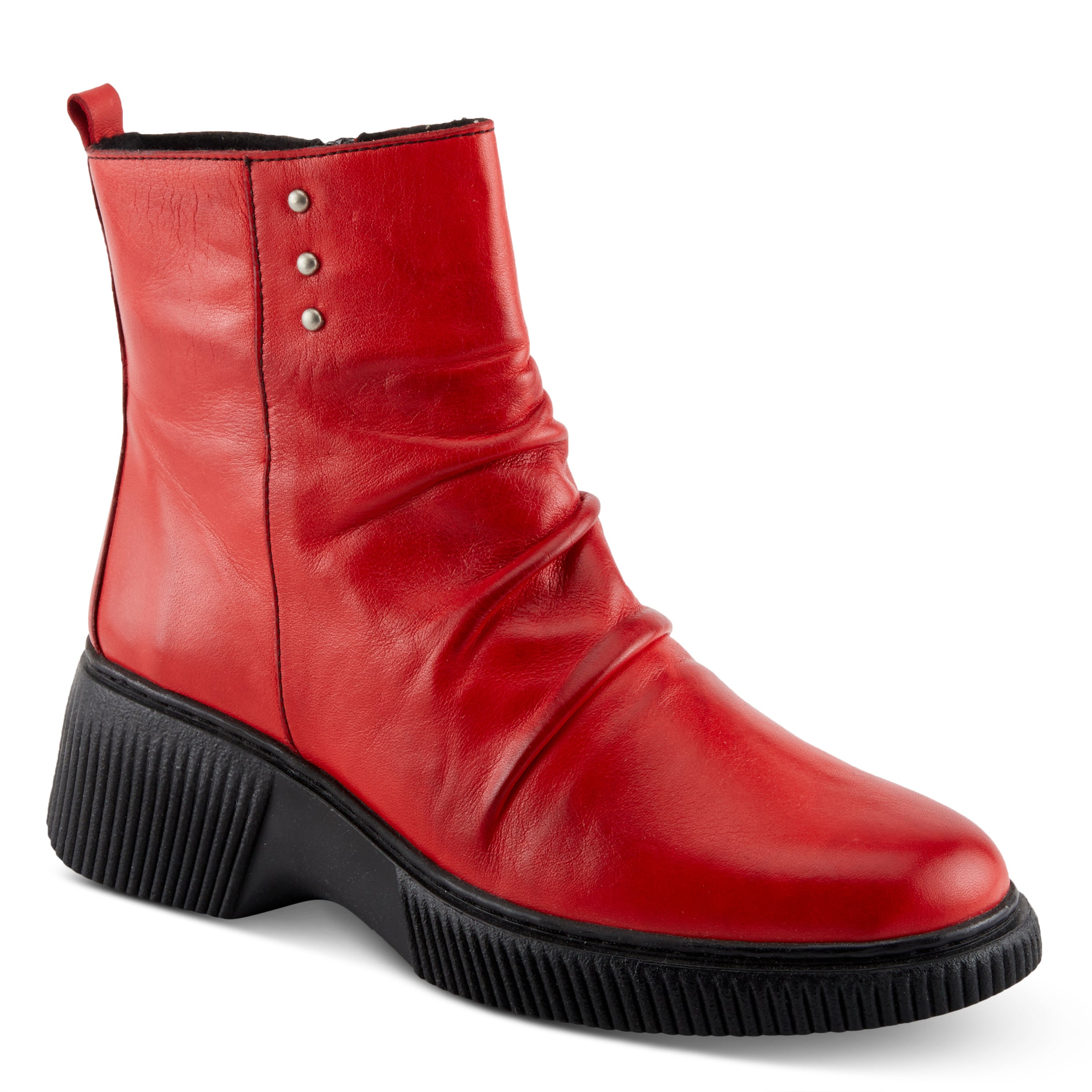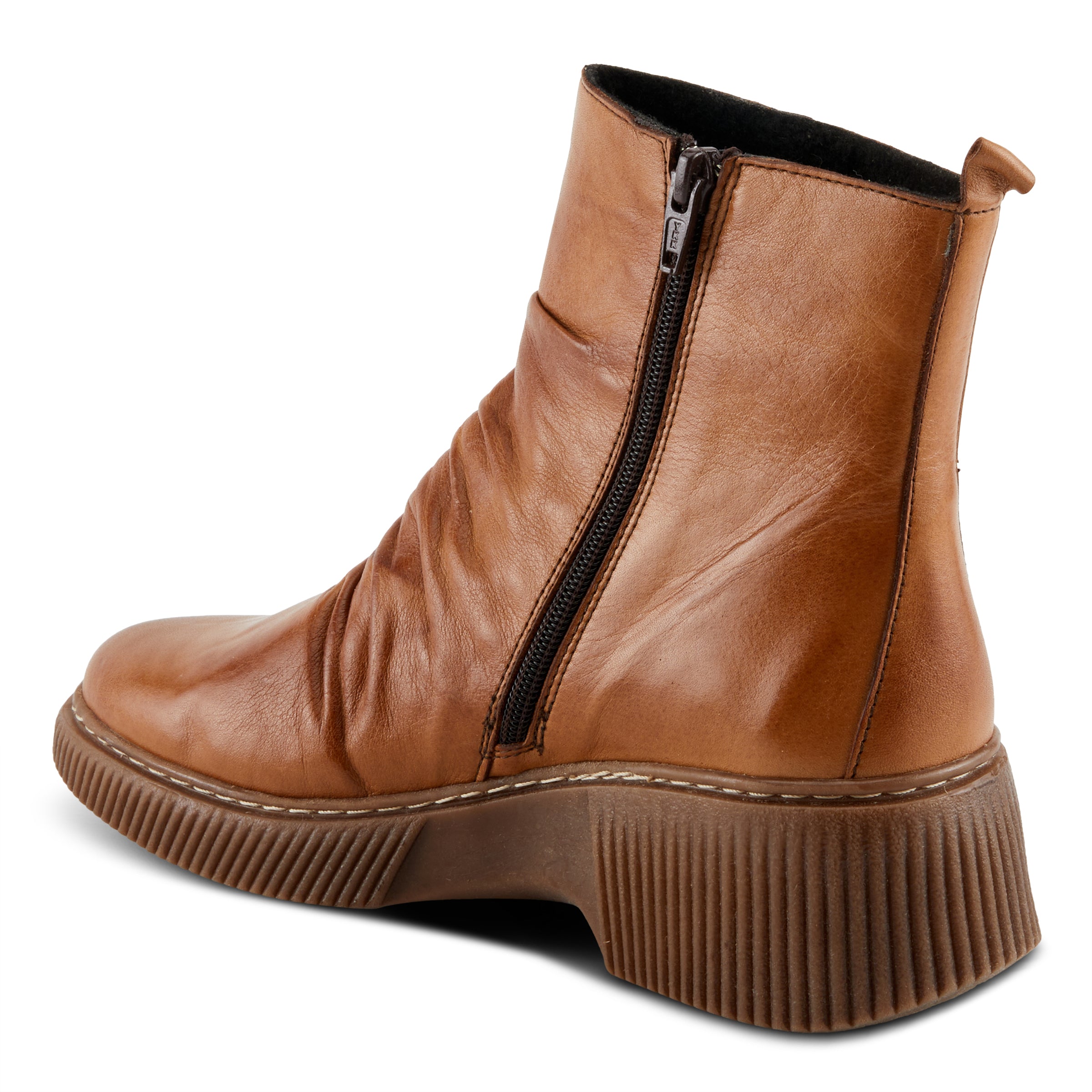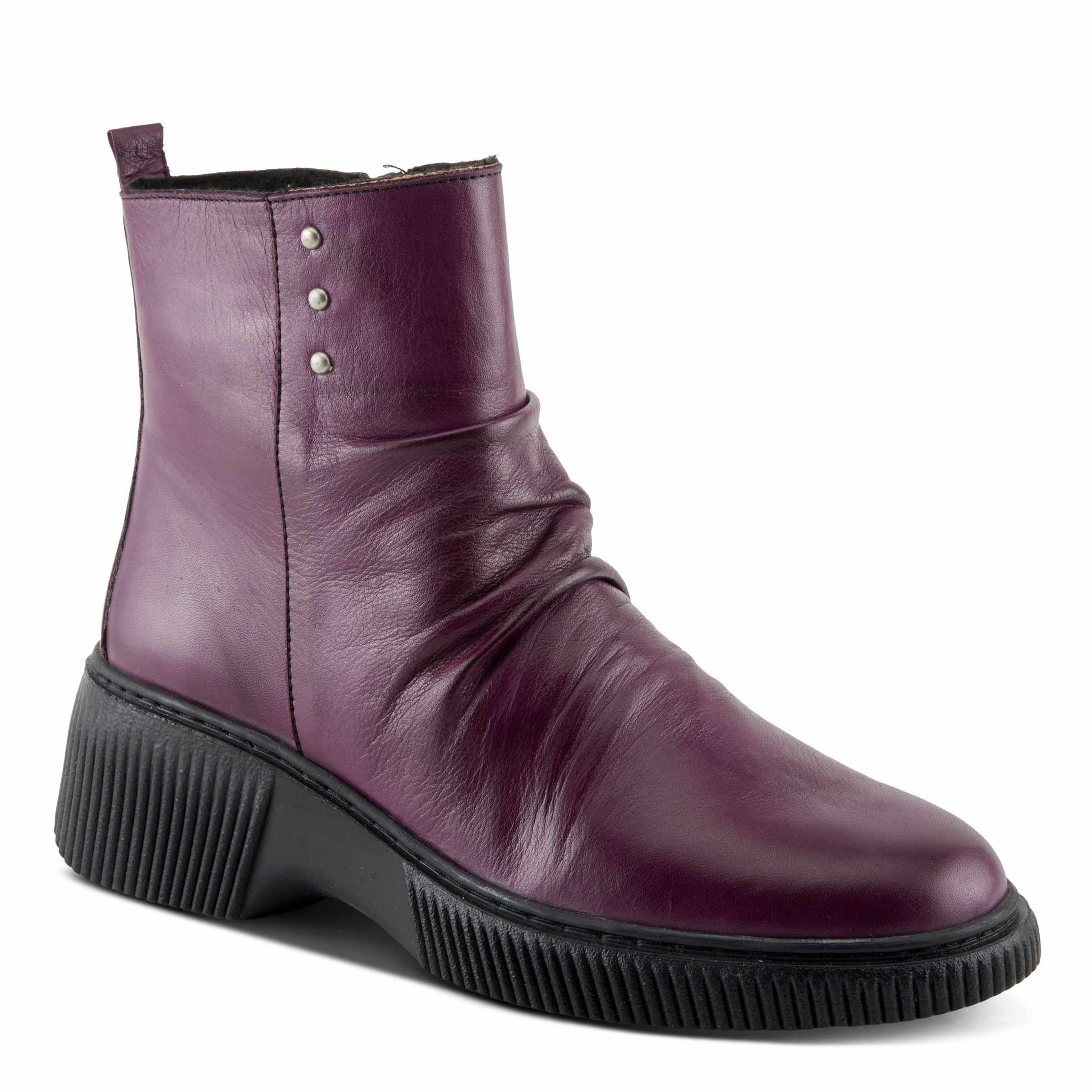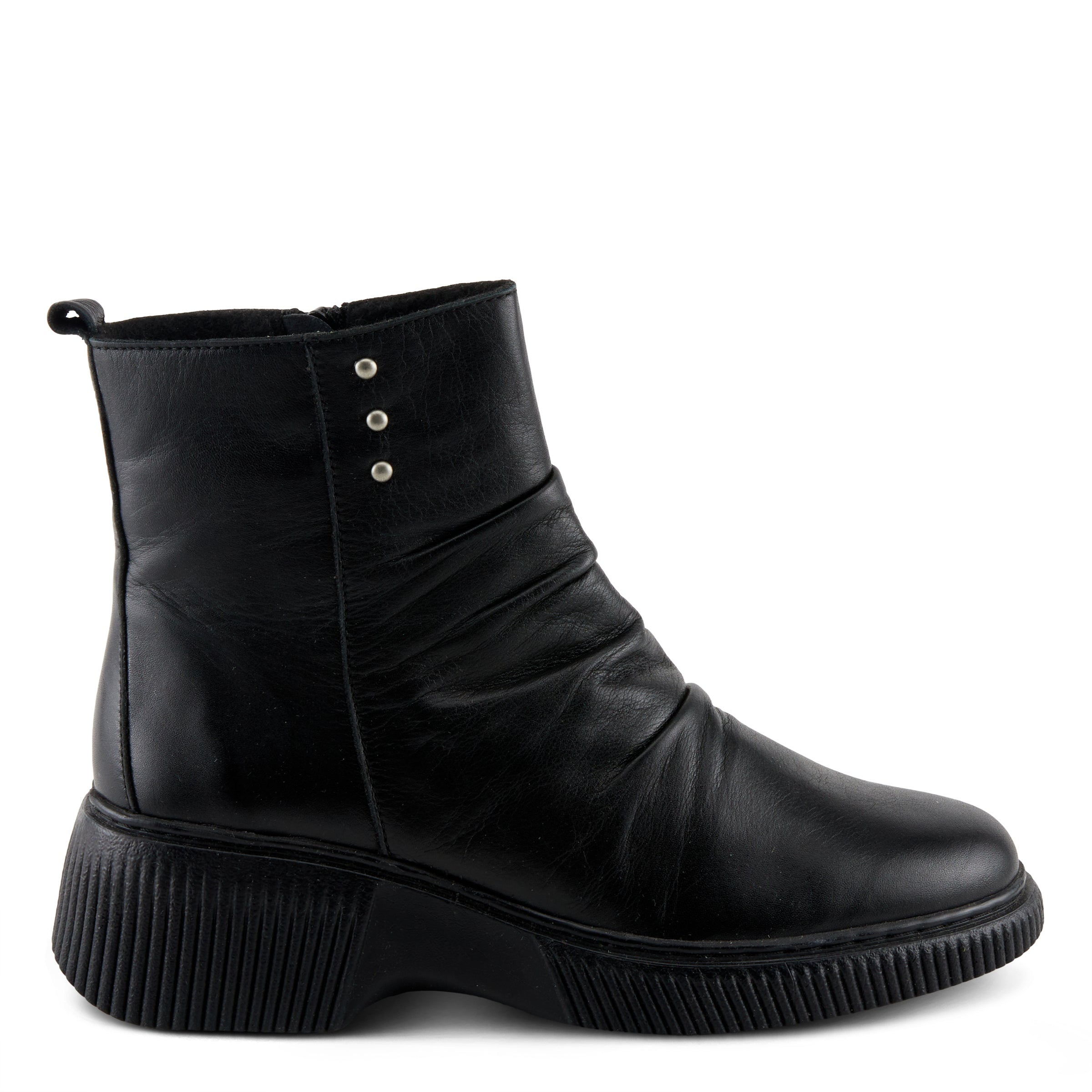 Elevate your fall/winter wardrobe with our casually chic bootie featuring a rusched leather upper adorned with metal rivets, complete with a convenient pull tab, inside zipper, and slightly lugged sole for added edge.