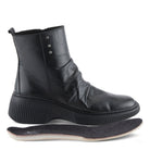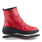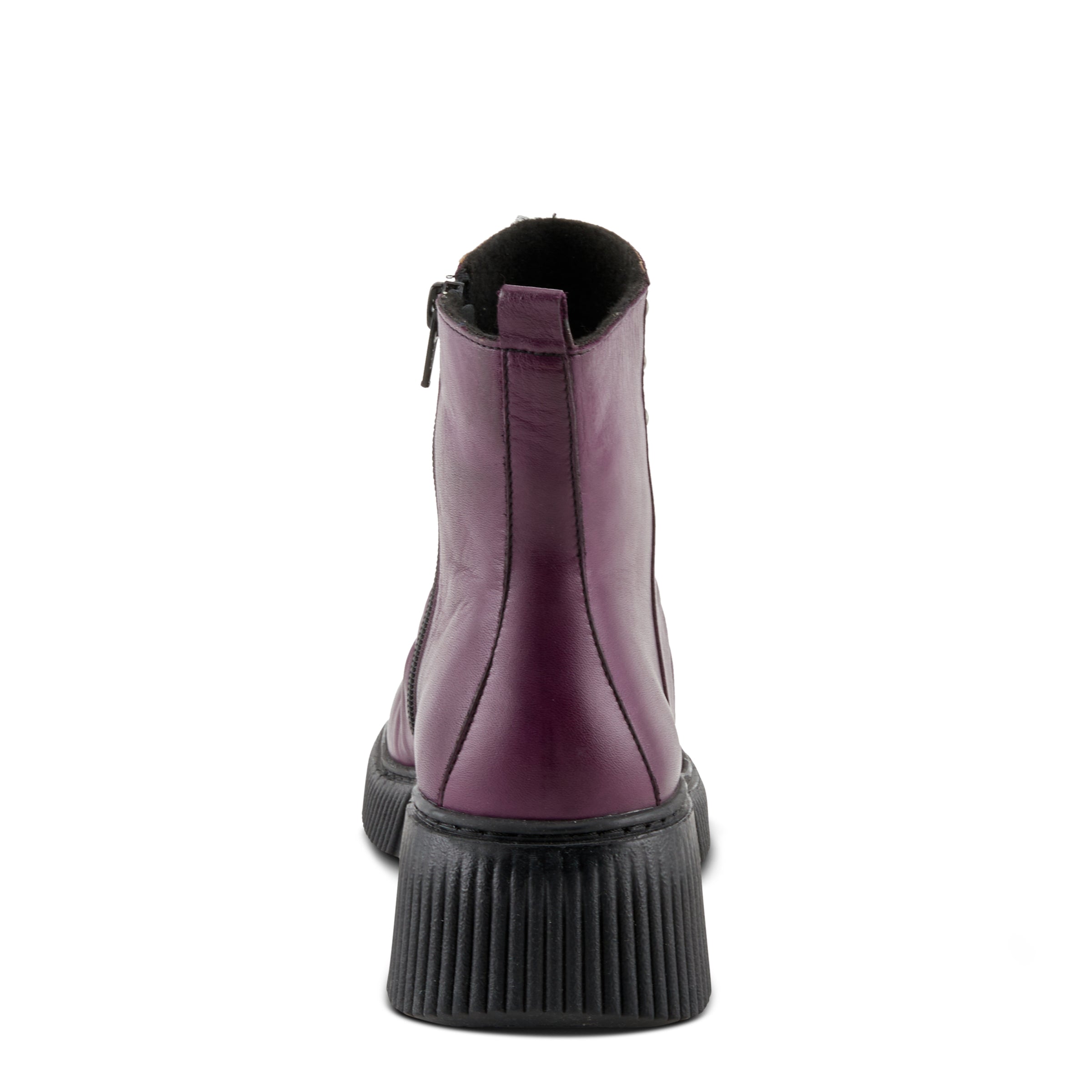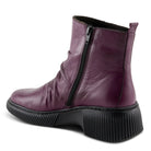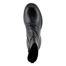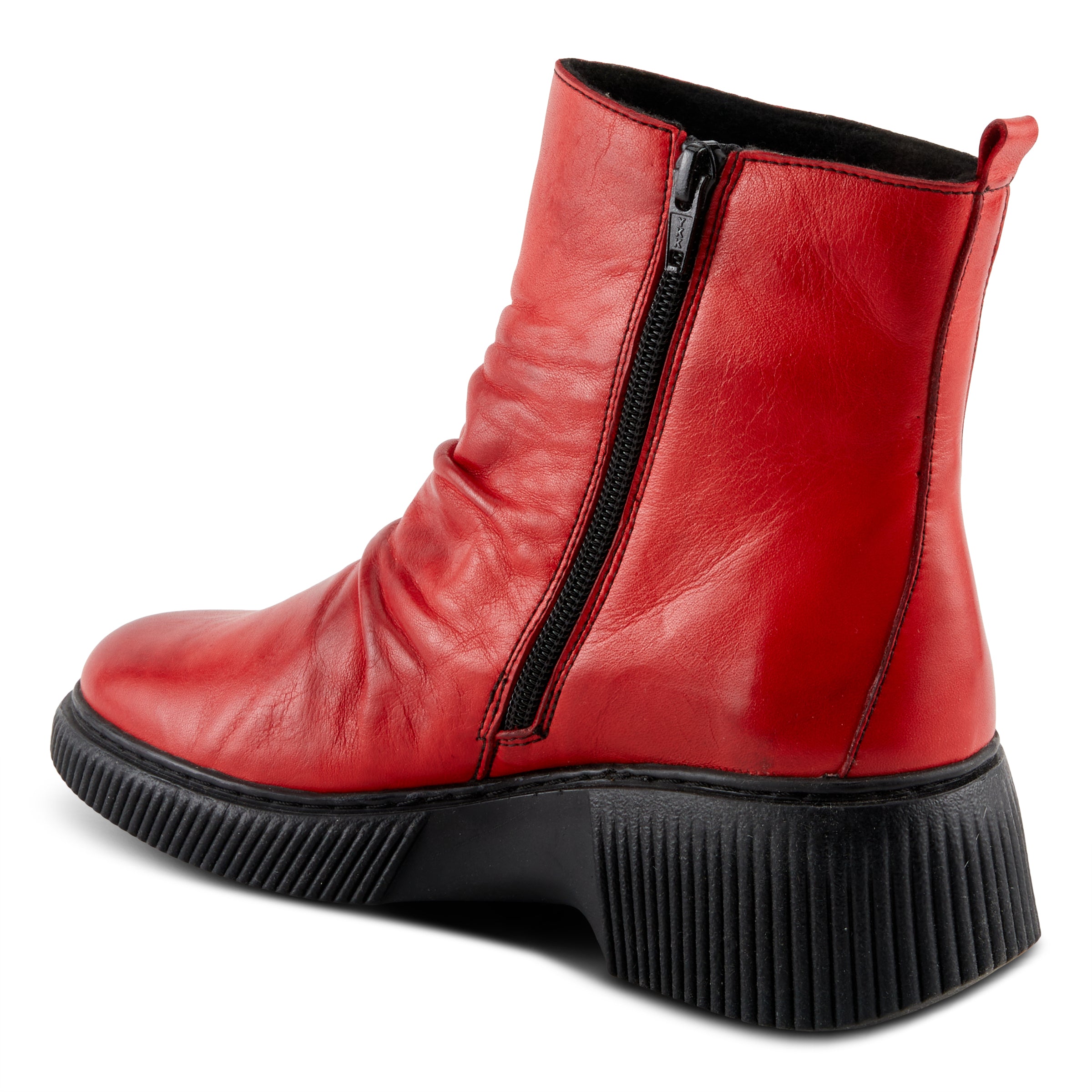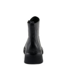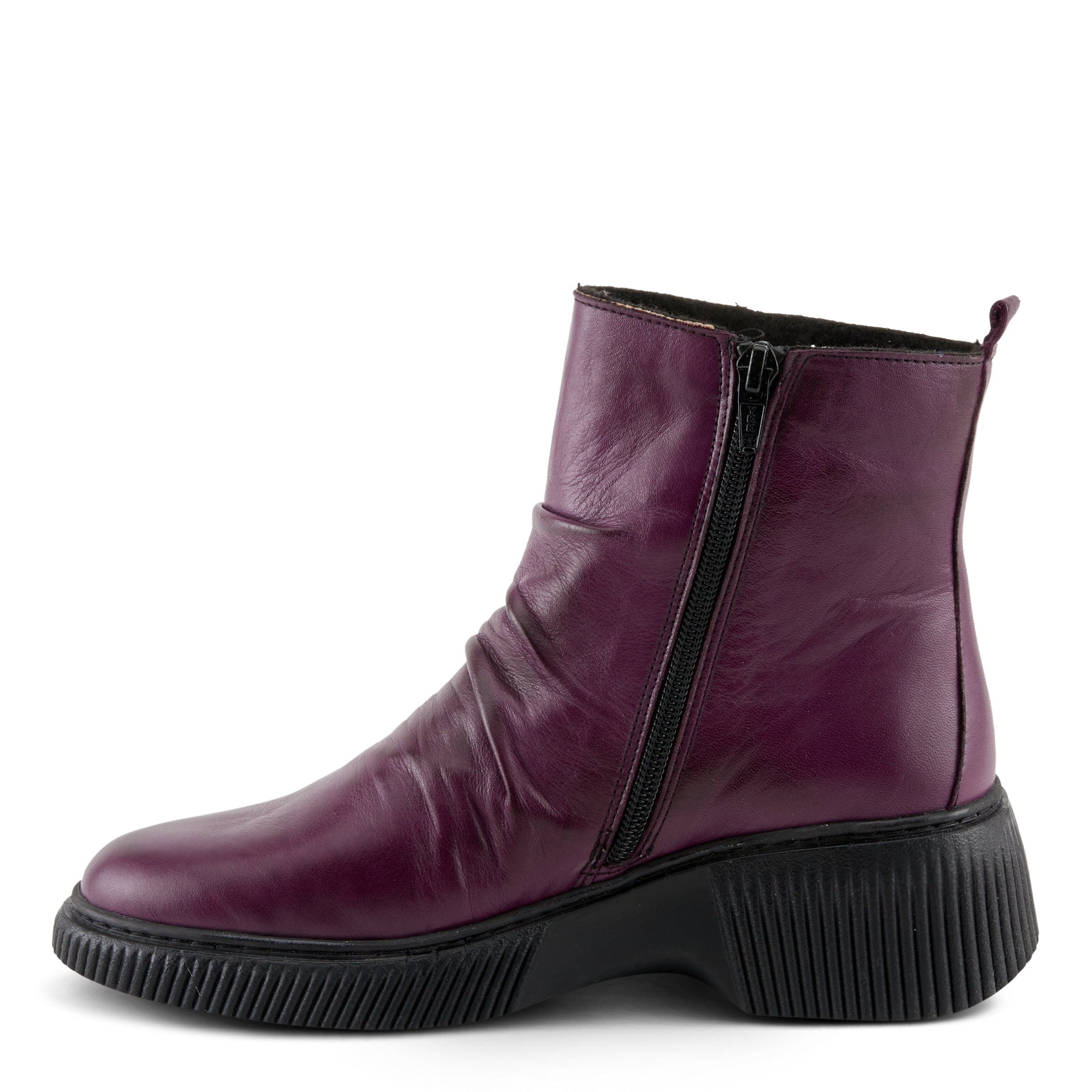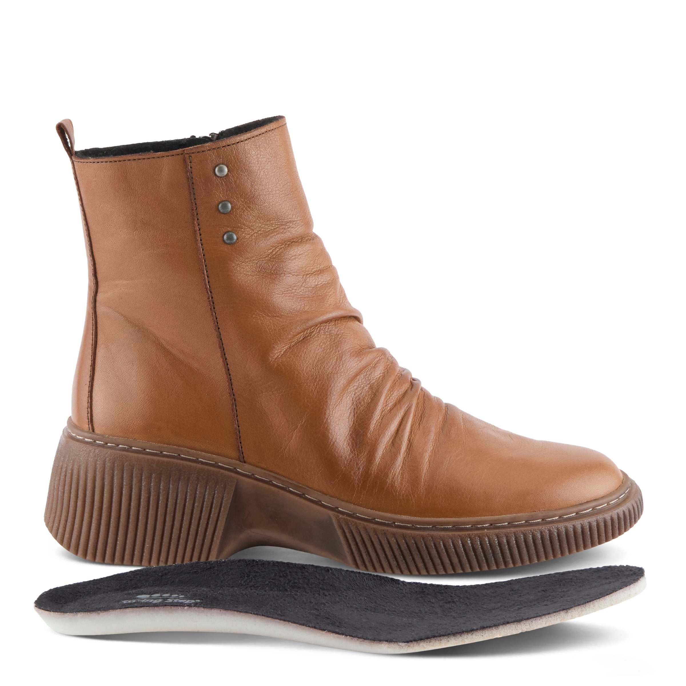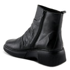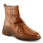 Elevate your fall/winter wardrobe with our casually chic bootie featuring a rusched leather upper adorned with metal rivets, complete with a convenient pull tab, inside zipper, and slightly lugged sole for added edge.