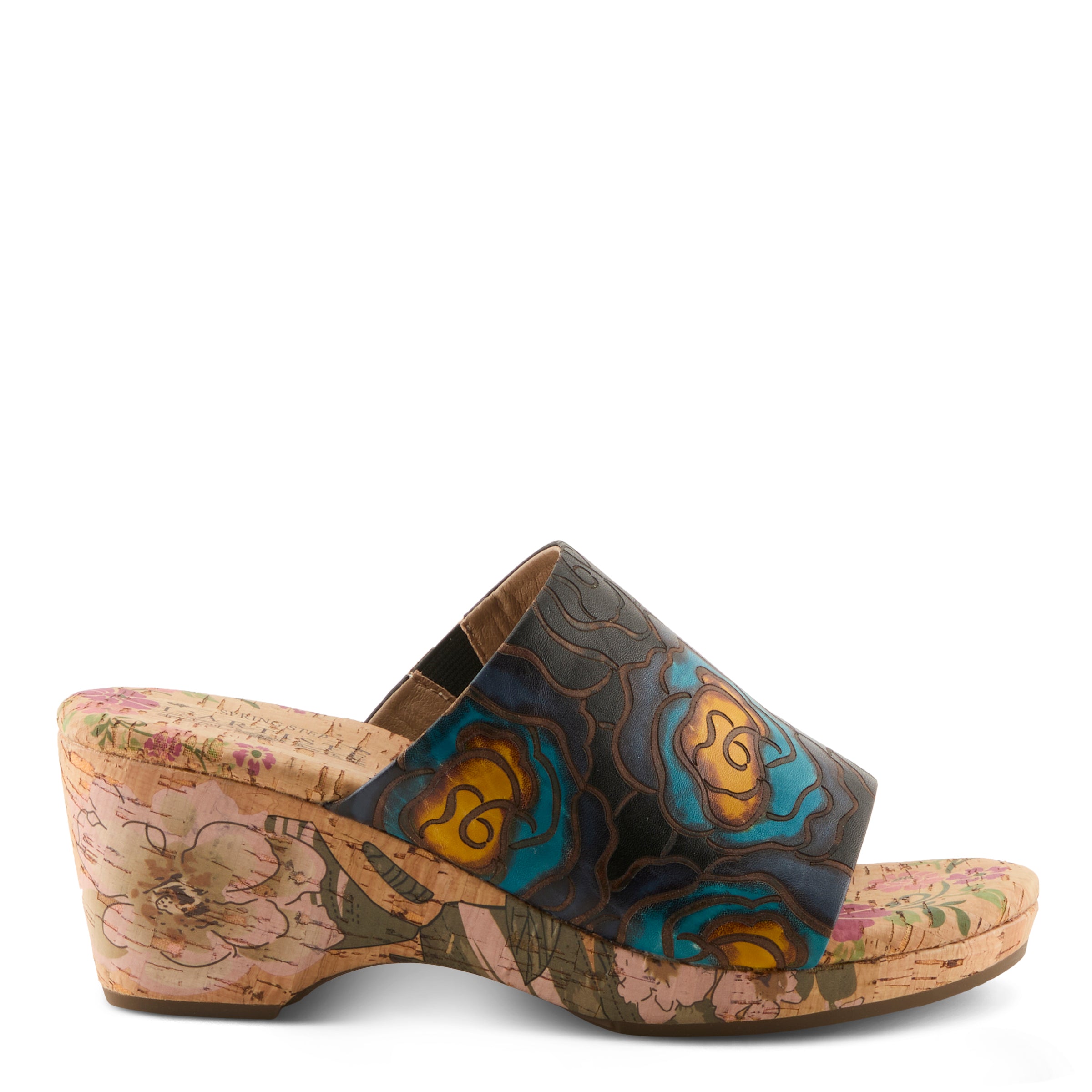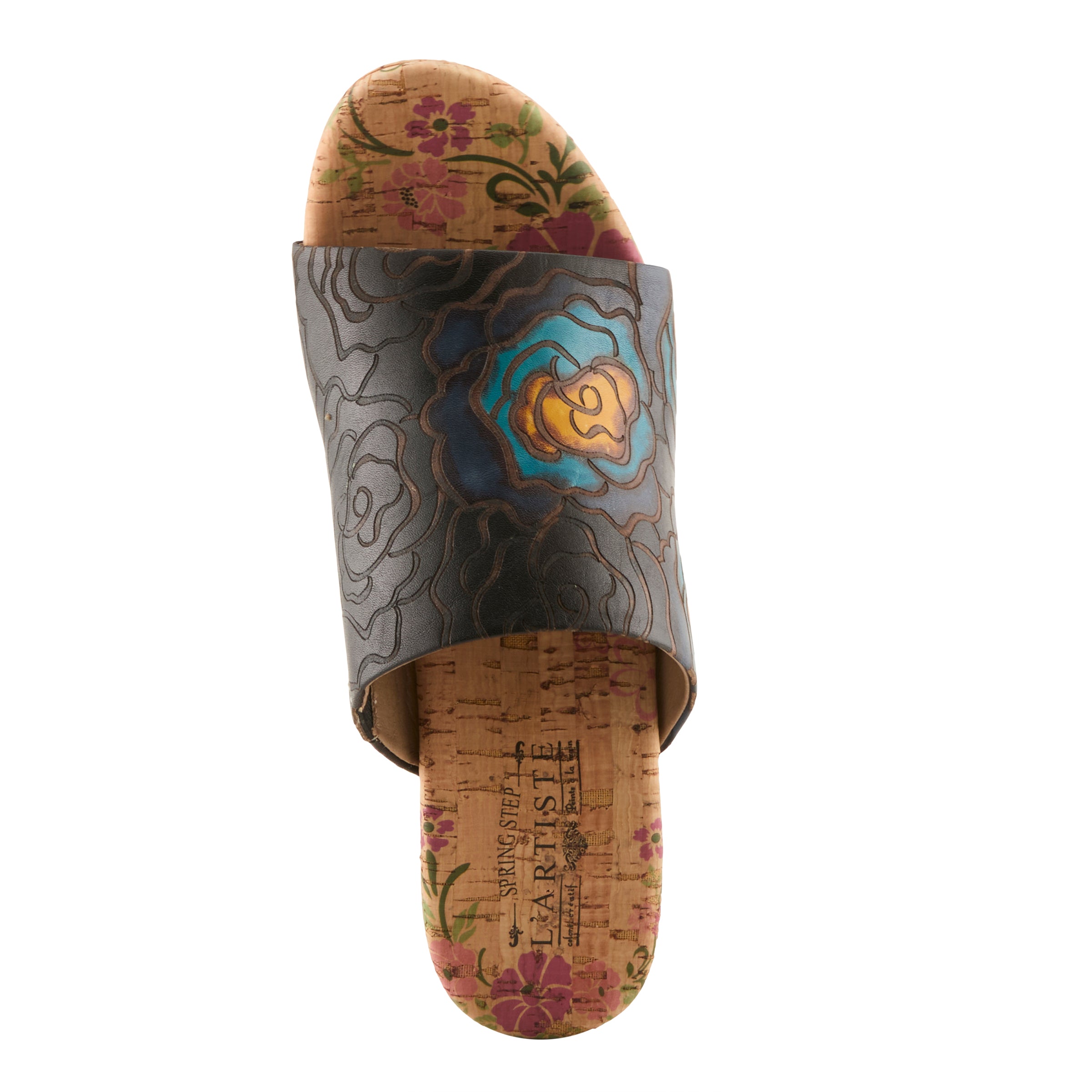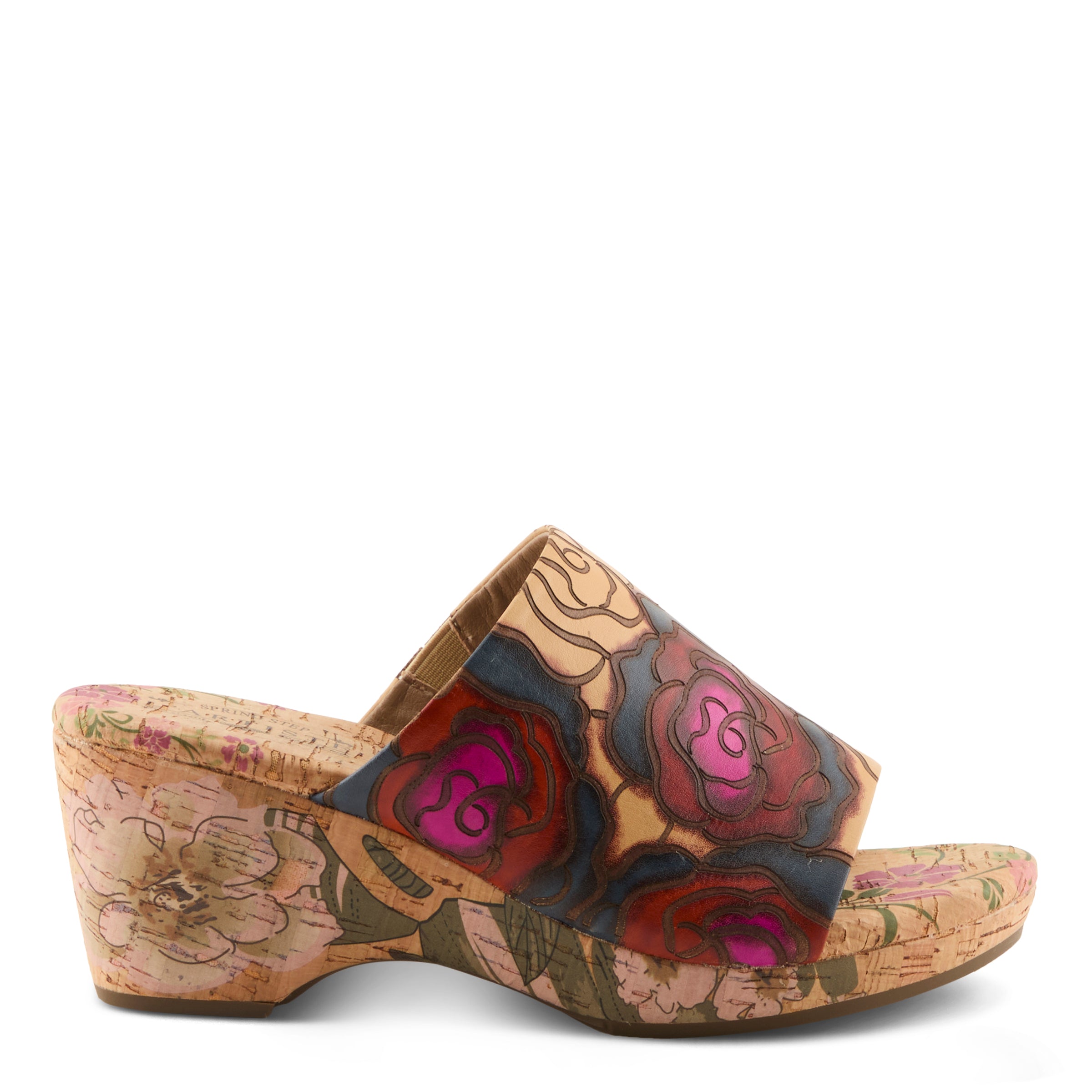 For the woman who loves bold expression without compromising ease, this slide sandal makes a statement that feels both fresh and sophisticated. The embossed leather upper features oversized hand-painted floral designs that pop with contemporary vibrance. The artistry continues beneath your step, with the cork midsole and insole hand-painted to extend the creative flair across the entire silhouette. The wide band gives coverage with style, while the slip-on construction speaks to today’s demand for effortless fashion. Lightweight yet striking, this wedge is designed to carry you from casual daytime outings to evening events with the same confident edge.