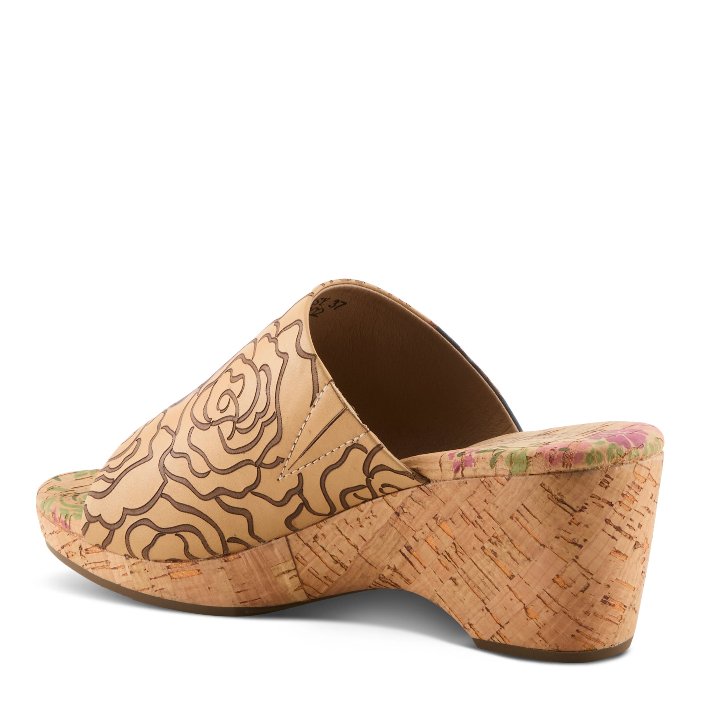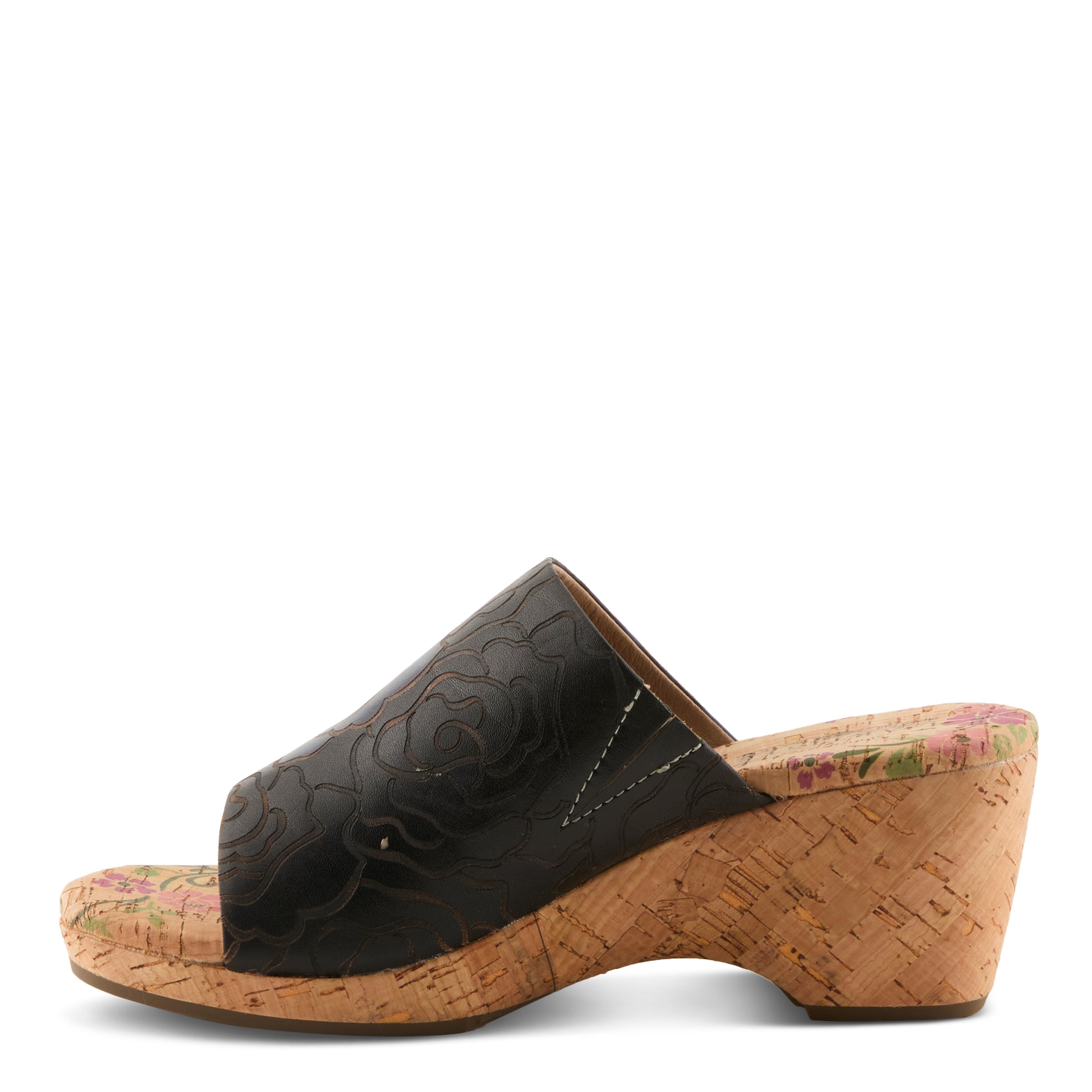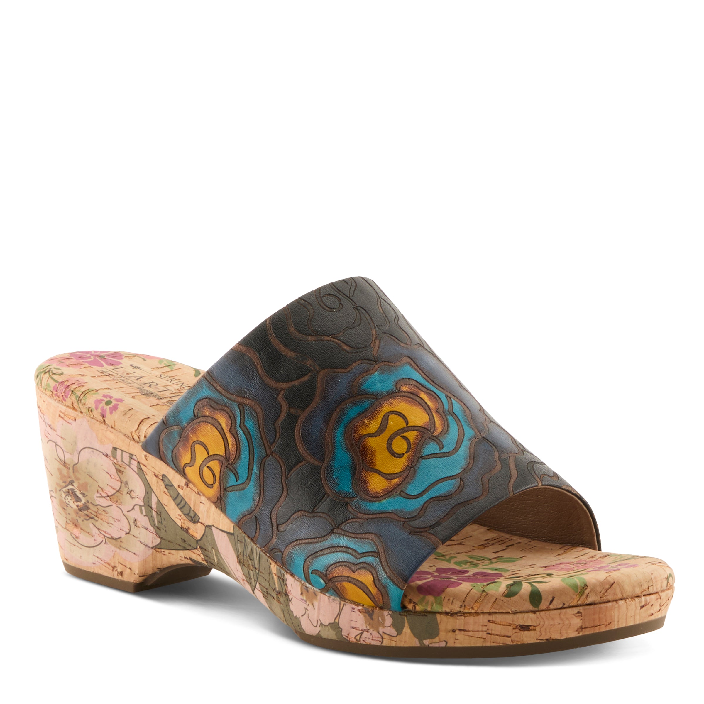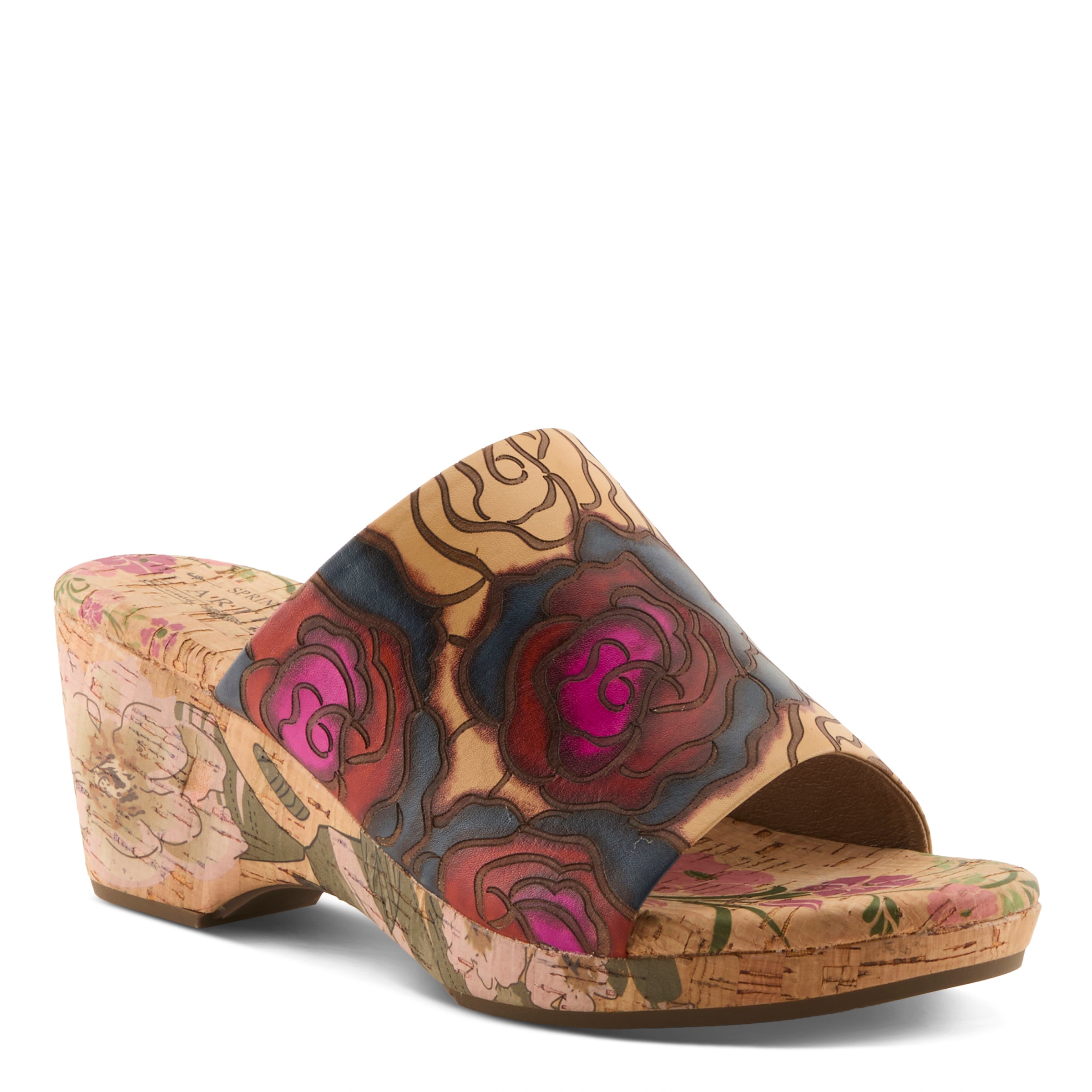 For the woman who loves bold expression without compromising ease, this slide sandal makes a statement that feels both fresh and sophisticated. The embossed leather upper features oversized hand-painted floral designs that pop with contemporary vibrance. The artistry continues beneath your step, with the cork midsole and insole hand-painted to extend the creative flair across the entire silhouette. The wide band gives coverage with style, while the slip-on construction speaks to today’s demand for effortless fashion. Lightweight yet striking, this wedge is designed to carry you from casual daytime outings to evening events with the same confident edge.