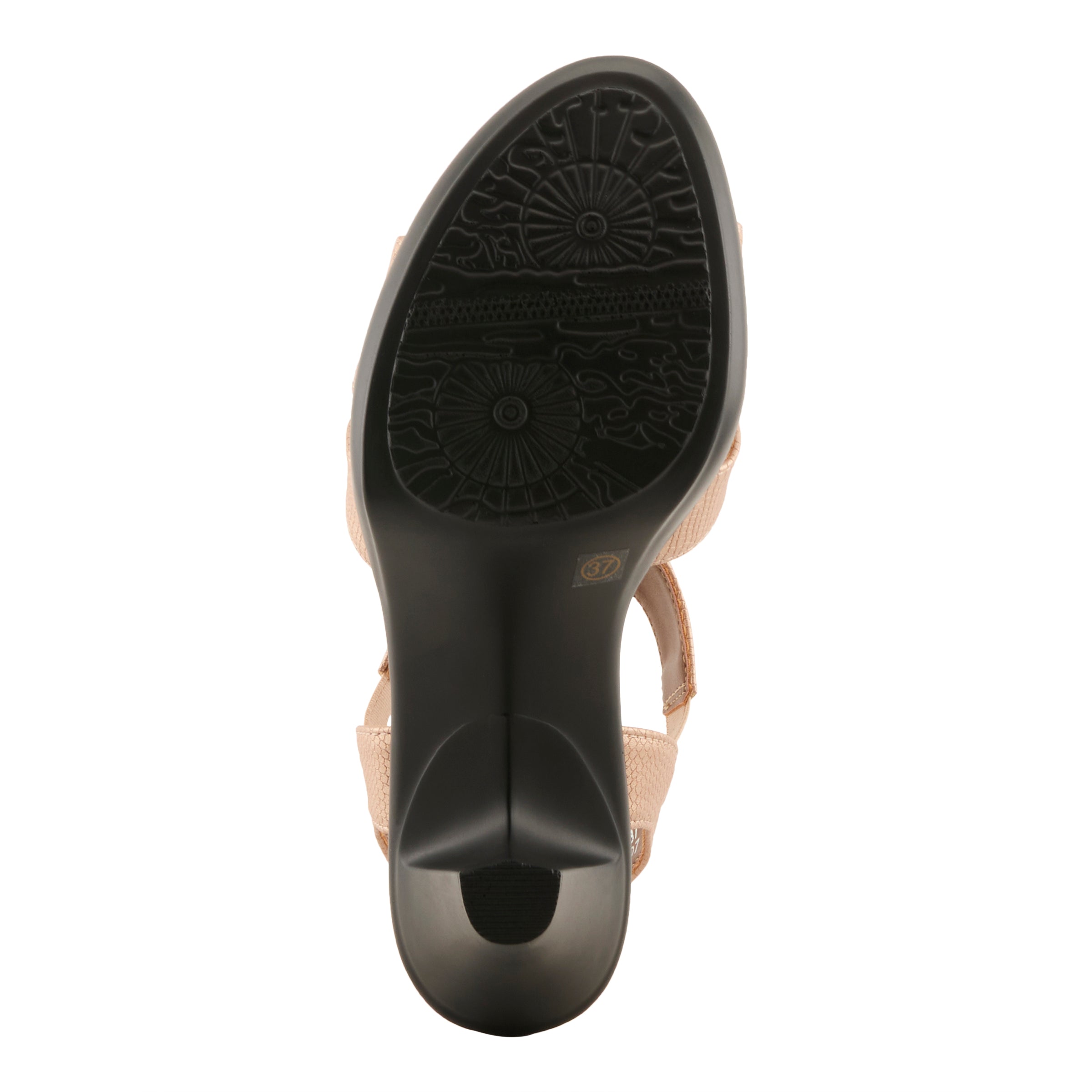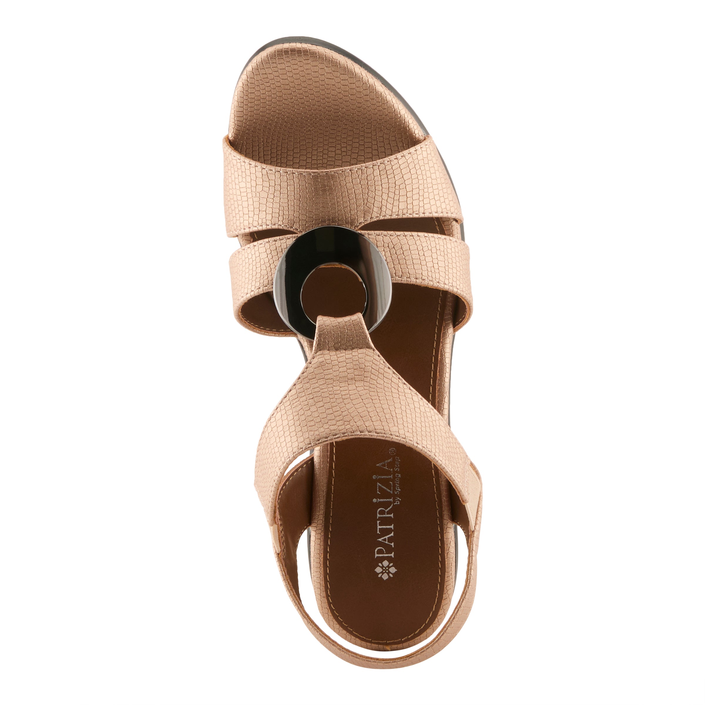 Classic dress sandal featuring a metallic ring ornament and incorporated stretch elastic design.