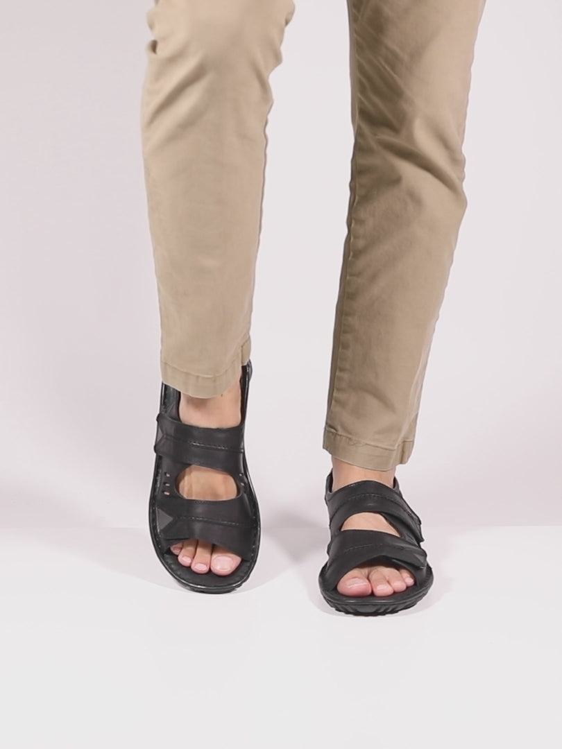 A corner stitch leather sandal which has dual straps with hook and loop fastening for adjustability and amazing fit. The leather covered adds to the comfort of this very soft and flexible sandal.