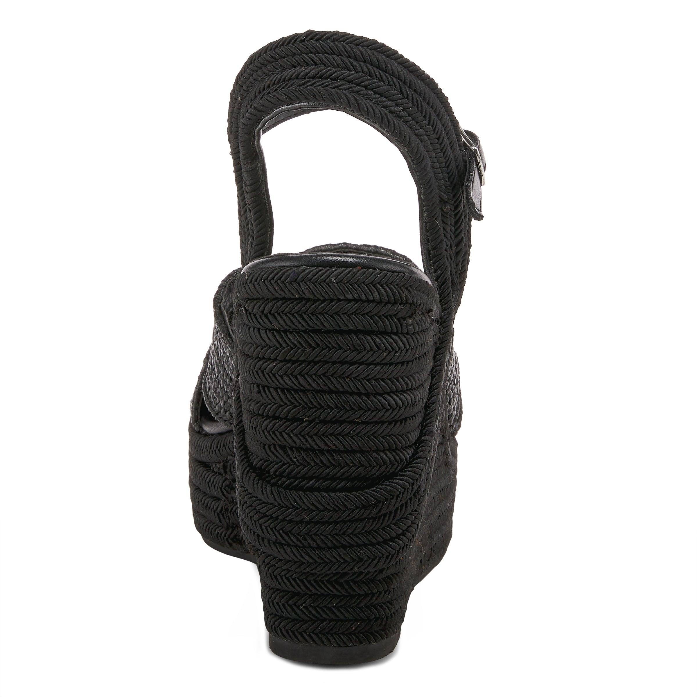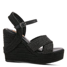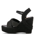 Stylish and trendy raffia inspired wedge sandal featuring a criss-cross design and a matching wrapped wedge unit with a platform.